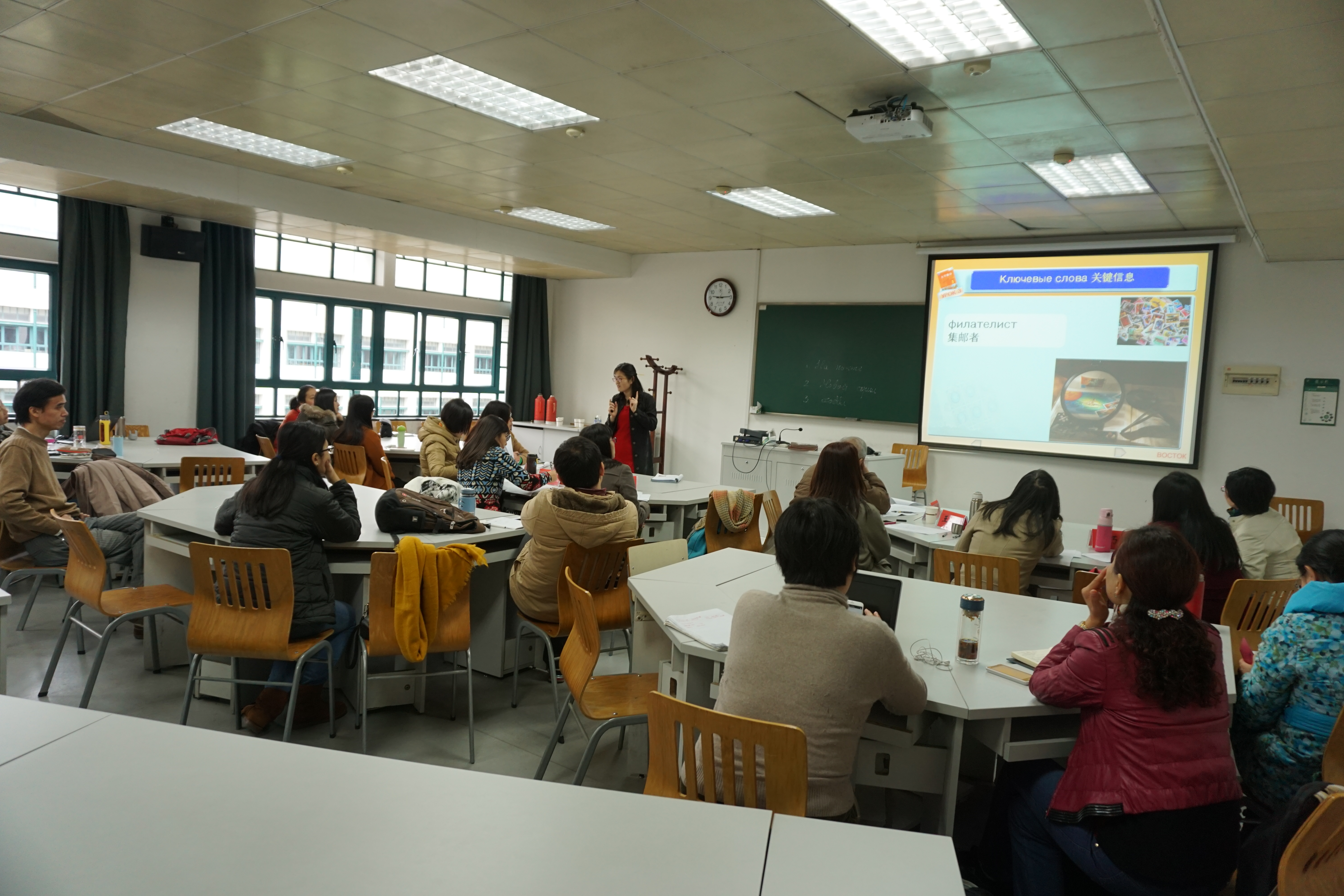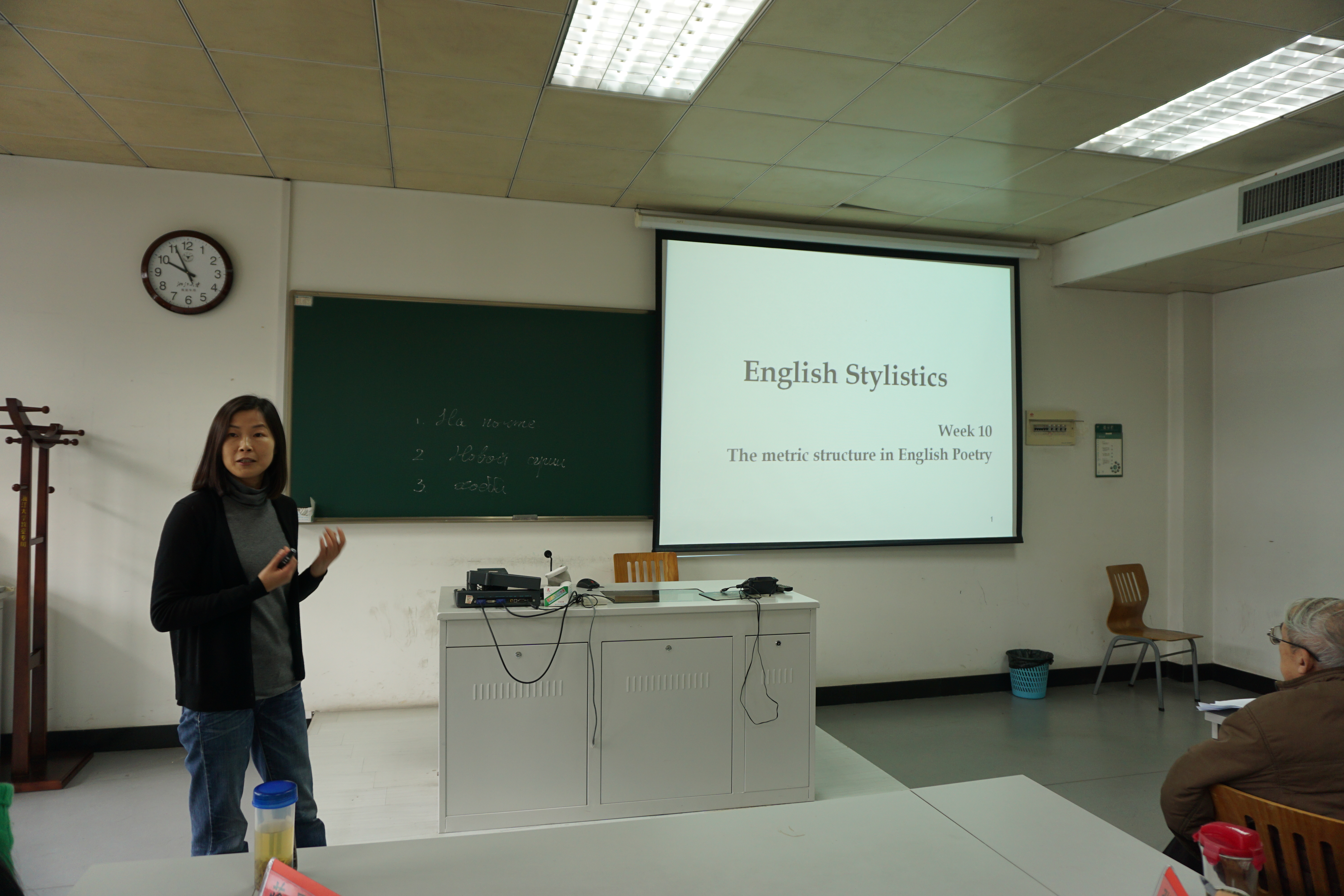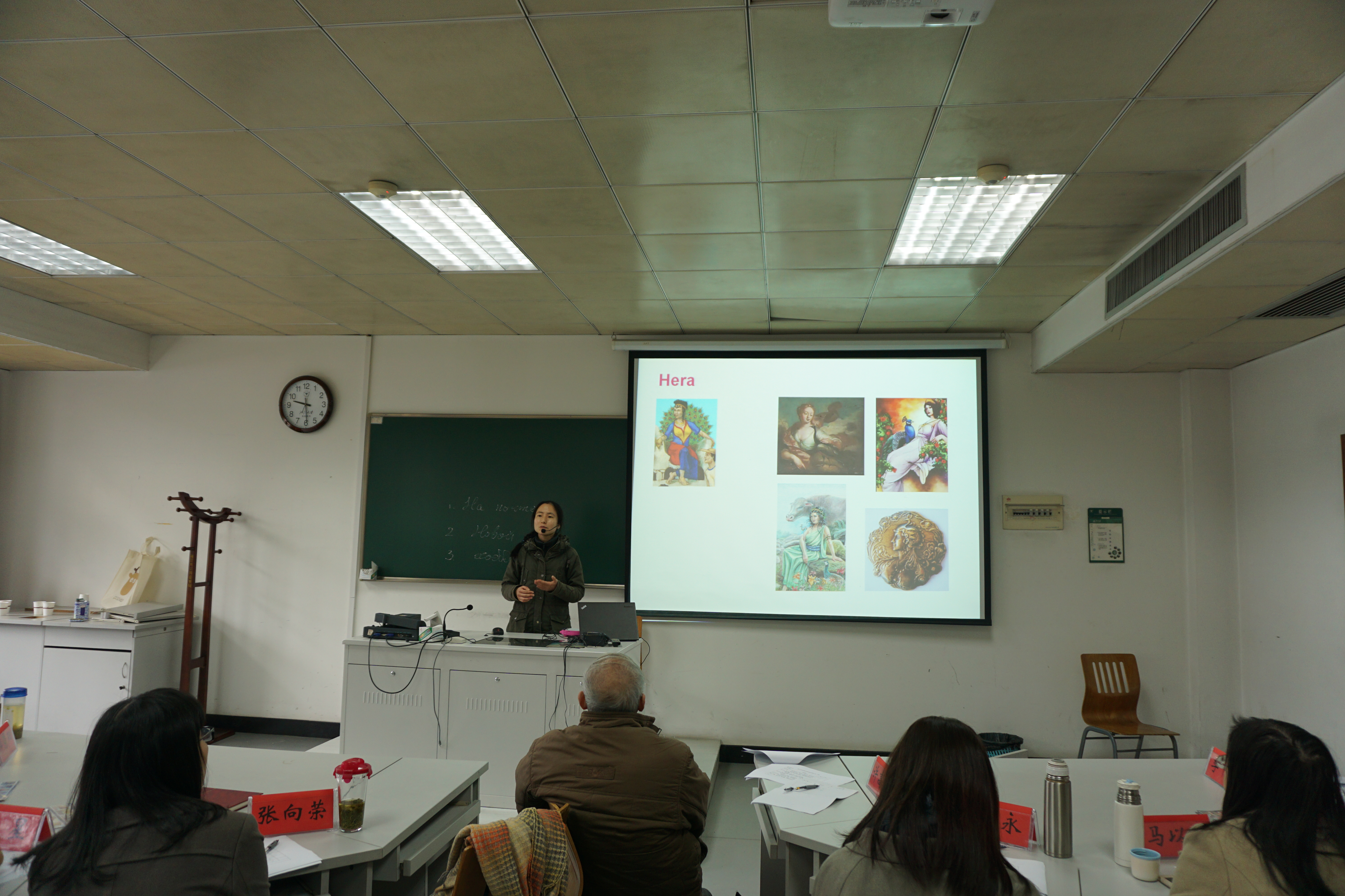 第一位上台的是来自德语专业的国懿老师。他从讲座上得到的灵感,以德国文化为背景,介绍了德国纳粹时期的文化。接下来各位教师选手陆续上台,每个人都展现了自己独有的特点与风格。配合各自的讲课内容,他们有的循循善诱、从容淡定,有的幽默风趣、热情洋溢,即便由于课程需要,一些小语种专业教师的讲课内容不是在场的每个人都能听懂,他们的风采还是完整地展现给了大家。为了尽量还原讲课现场,选手大都在展示中加入了许多互动环节。比如,朱晔老师在讲解诗歌的韵律时,请老师来扮演学生跟着她朗读,上课氛围十分活跃。