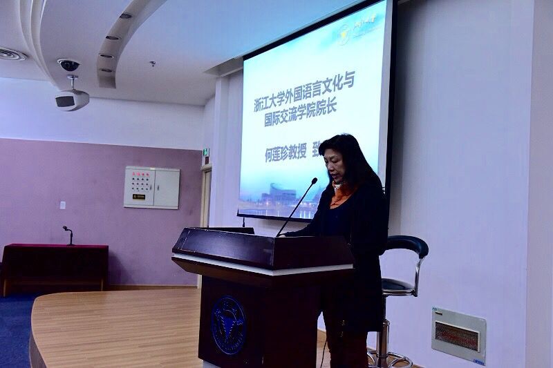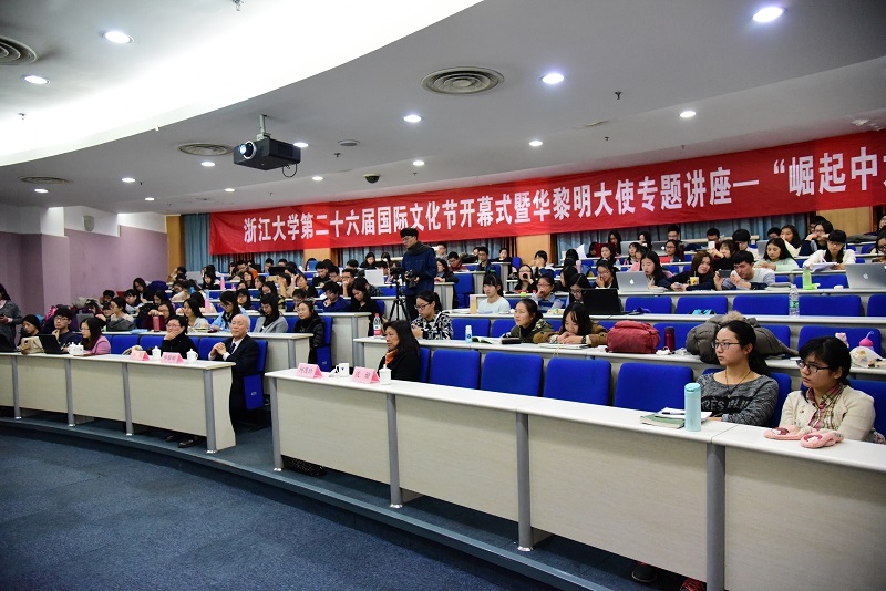 2015年12月3日晚6点半,浙江大学第二十六届国际文化节开幕式暨华黎明大使专题讲座在紫金港校区国会223报告厅举行。中国联合国协会常务理事、中国国际问题研究院特聘研究员、前中国驻伊朗、阿联酋、荷兰大使及中国常驻禁止化学武器组织代表华黎明、浙江大学外语学院院长何莲珍、外语学院副院长李媛及外语学院党委副书记沈燎等出席了本次活动。开幕式由沈燎副书记主持。