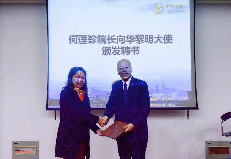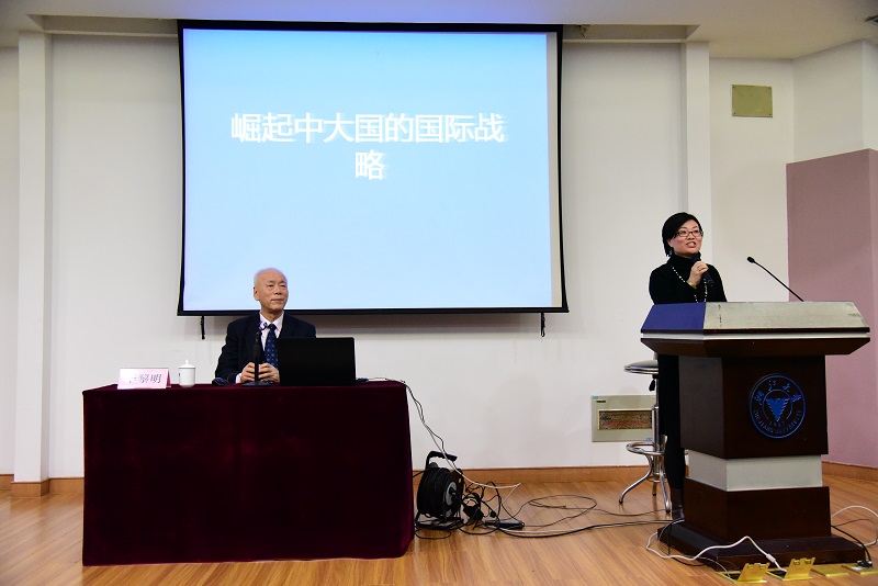 在华黎明大使专题讲座正式开始之前,外语学院院长何莲珍教授为华黎明大使颁发外语学院国际组织精英人才班实践导师聘书。之后,大家期待已久的华黎明大使专题讲座——“崛起中大国的国际战略”正式开始。讲座由李媛副院长主持。