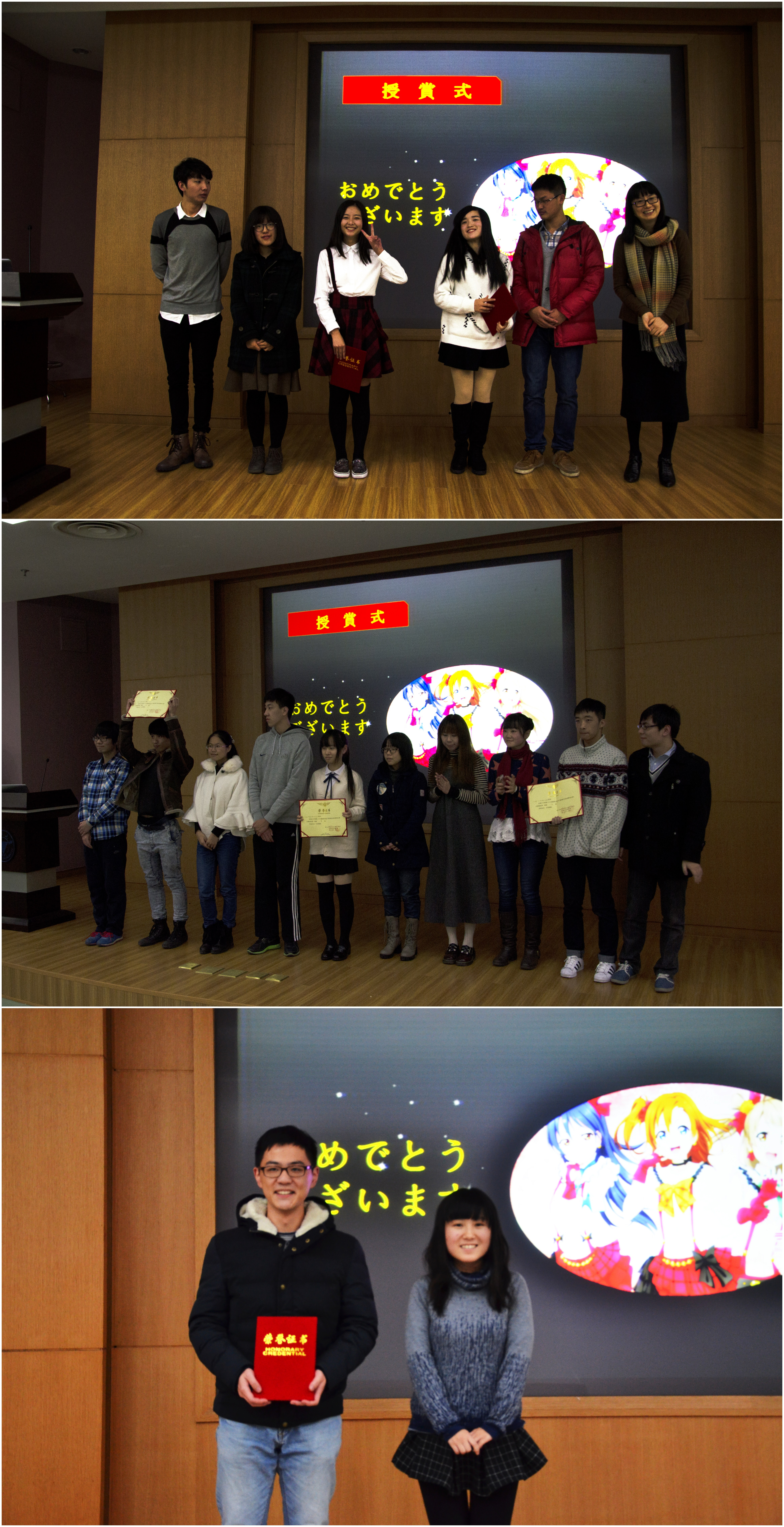 赛后由张向荣老师公布大赛结果,阿莉塔老师等评委和嘉宾为参赛队伍颁发获奖证书。最后,评委老师、参赛选手、观众以及协会成员合影留念。第四届日语动漫配音大赛在轻松愉快的氛围中顺利落下帷幕。