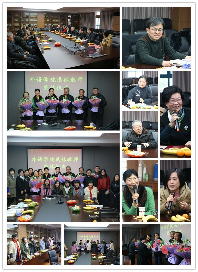 立德树人满桃李,薪火相传数代人。12月28日下午,外语学院为2015年光荣退休的黄建滨、李铭、陆润华、杜洋、叶小曼、姚暨荣、郑达华等七位教职工举办了温馨的荣休欢送仪式。学院党委书记褚超孚、副院长李媛、相关系所负责人、院机关同仁参加了本次欢送会,会议由分管离退休工作的学院党委副书记沈燎老师主持。
