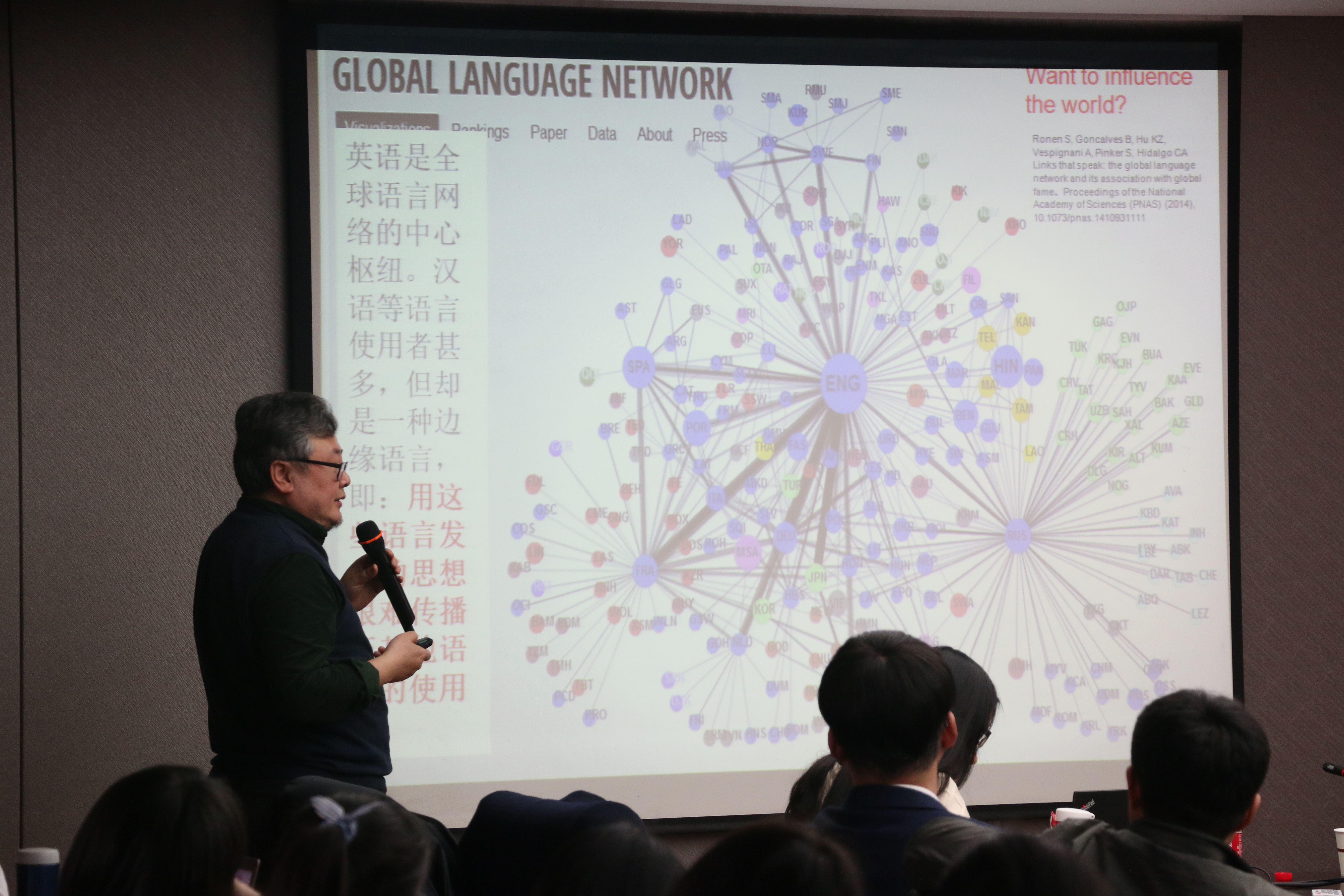 “研究意味着长期围绕着一个充满不确定性的项目持续工作,少则几周,多则数十年,而专注精神是科研者最核心的素质。”刘海涛教授说。由刘海涛教授团队创作的研究成果——《语言是一个多层级系统》于2014年发表在Journal of Chinese Linguistics(JCL)《中国语言学报》上,收到了国内外学界的广泛关注。刘教授告诉在场师生,这项研究前后经历了长达八年,并以此为例,鼓励在场青年学者应不断磨练并提高自身的科研素养。