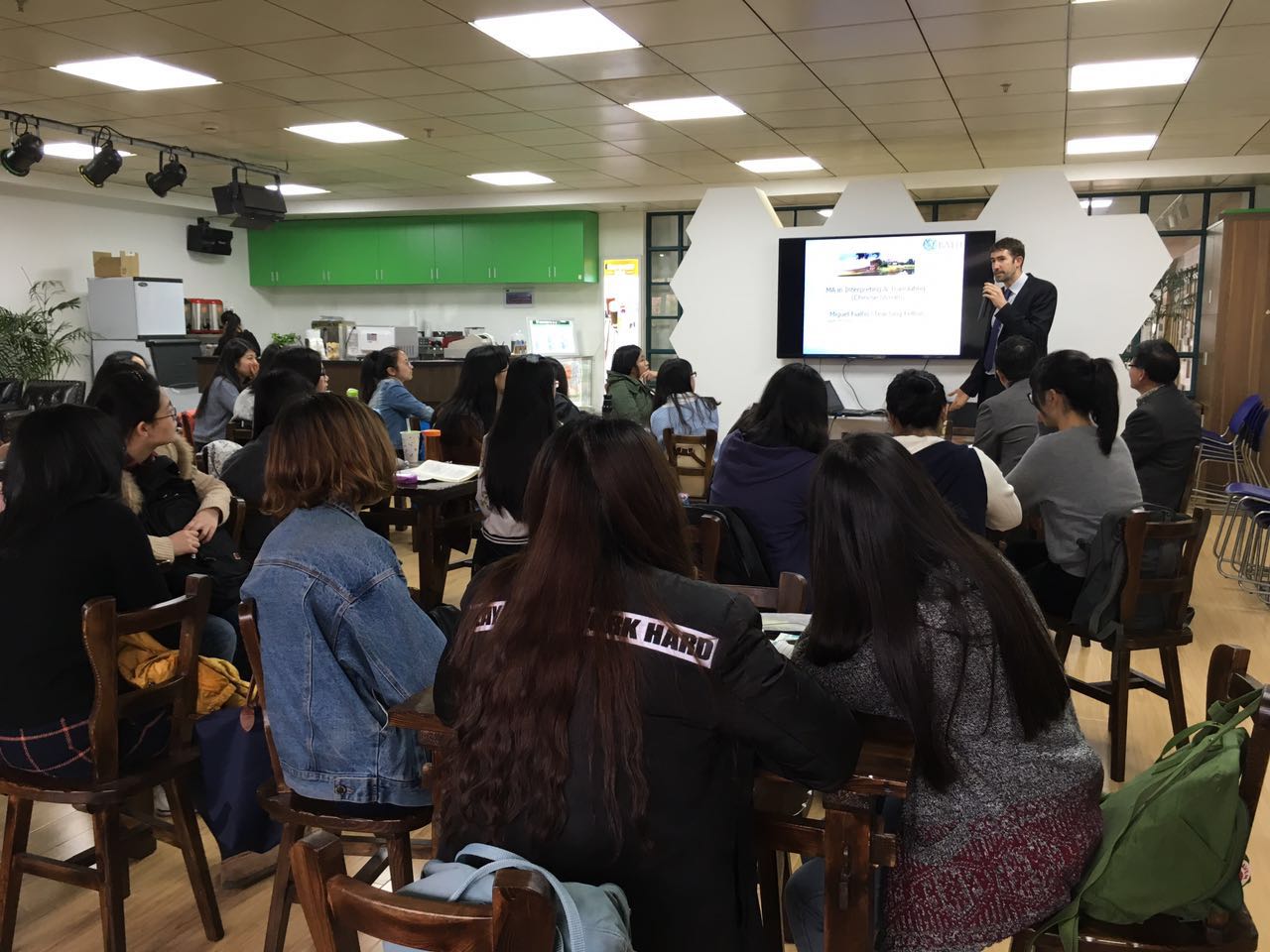 2016年3月18号下午,英国巴斯大学口译项目宣讲会在外语学院青荷咖啡吧顺利举行。主讲人为巴斯校方项目负责老师Miguel Fialho, 宣讲会由外语学院翻译学研究所所长郭国良老师主持。