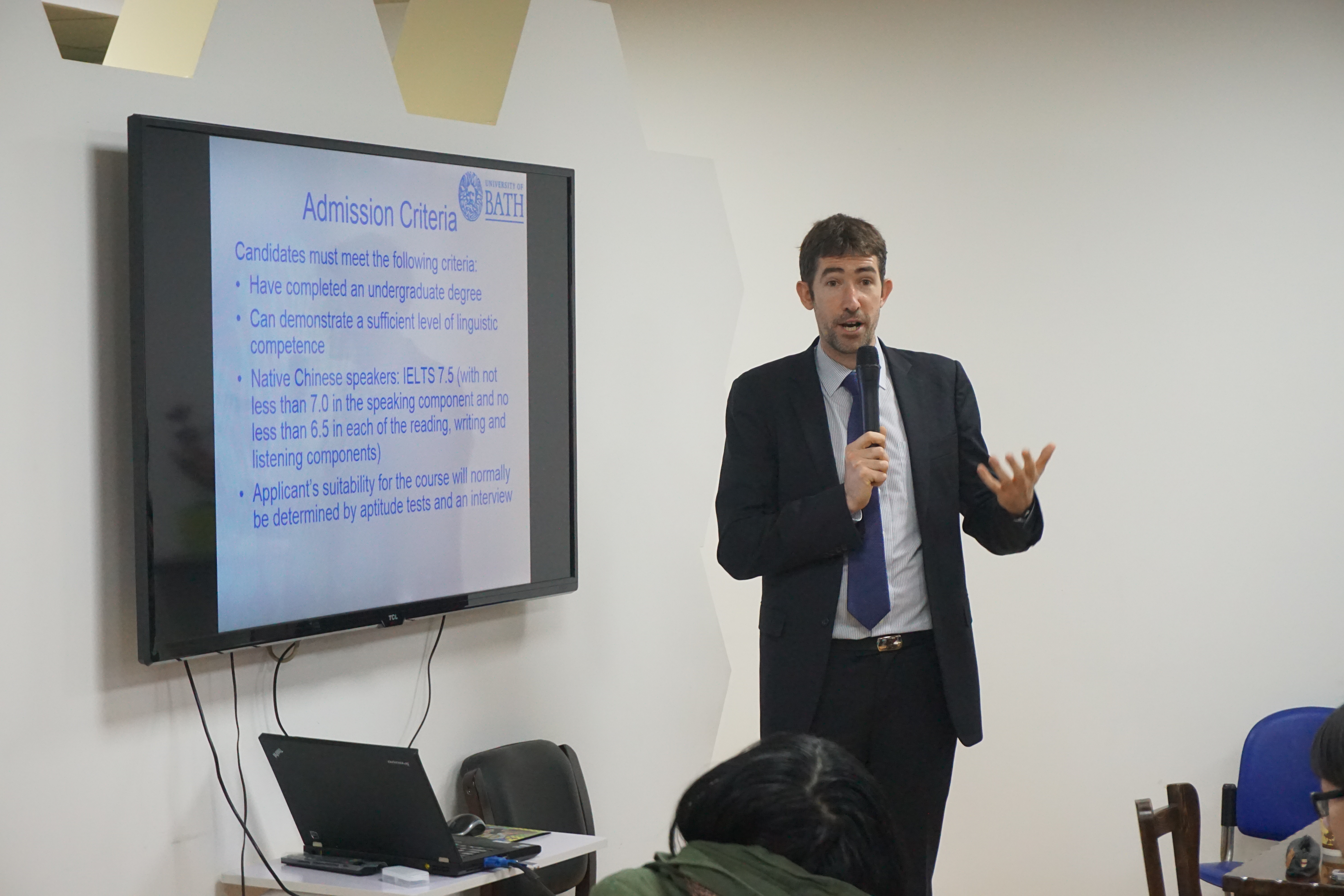 这次,巴斯大学校方项目负责人专程前来浙大面试16年外语学院申报该项目的同学,并举行项目宣讲会。 经过几个暖场小玩笑后,巴斯大学Miguel Fialho老师开始进入正题,整个宣讲会分为三部分。