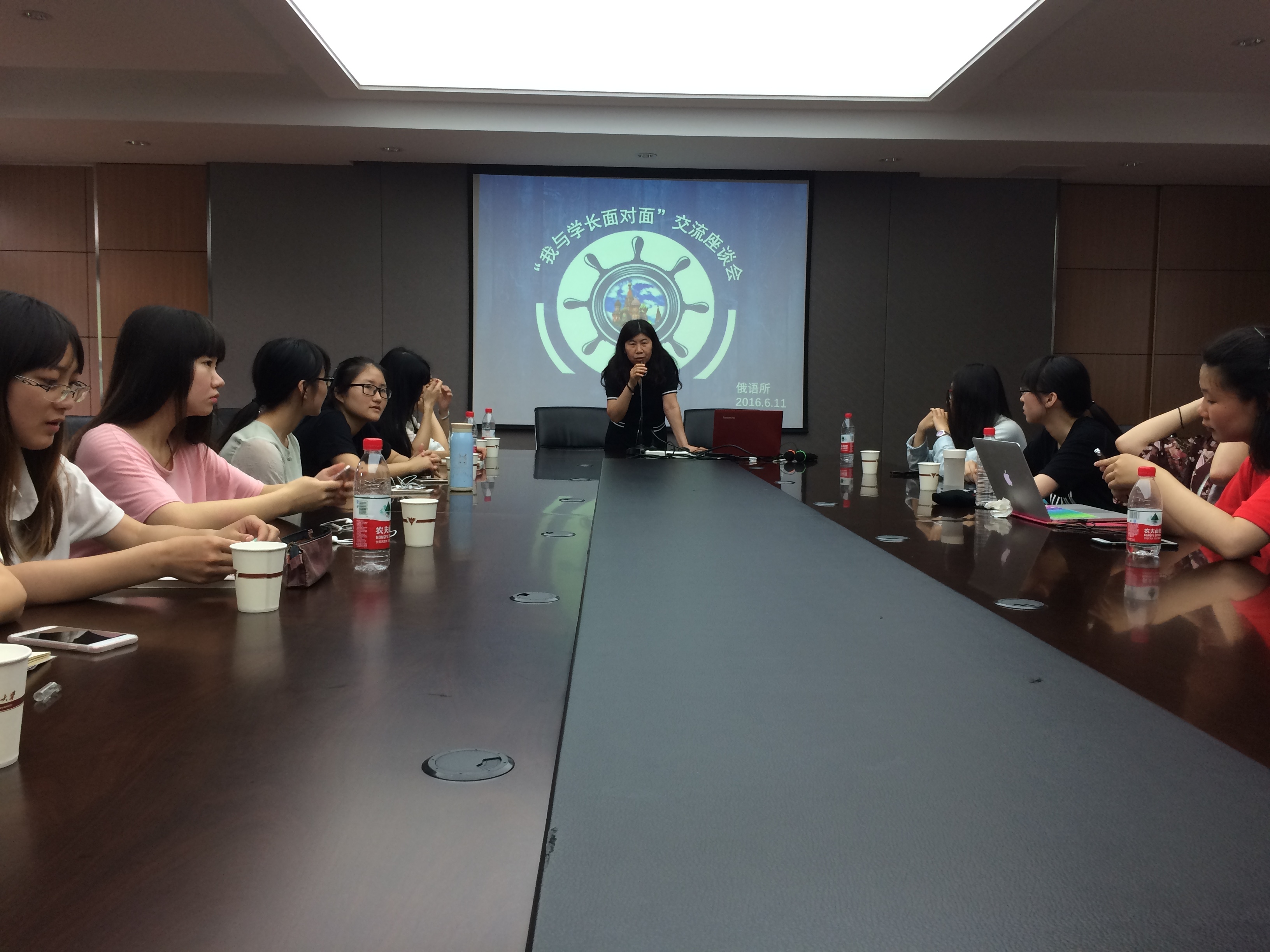 2016年6月11日14时,浙大俄语所于东5-201举行了“我与学长面对面”座谈会。本次座谈会由陈新宇老师主持,俄语系毕业的殷灵秀、张杰雅、邱晨晨三位学姐和浙大博士在读李昊天学长应邀参加。其中,邱晨晨学姐因工作临时安排无法到场,但仍然以视频的形式参会。