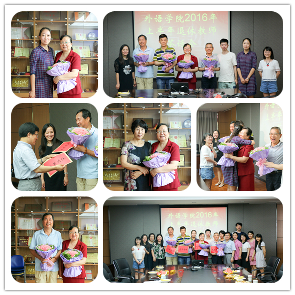 战歌声中铸丹心;桃李飘香万树春。6月30日上午,外语学院为2016年上半年光荣退休的李士燹、吴昶、韩燕、孟筱敏、孙海燕等五位教职工举办了温馨的荣休茶话会。学院党委书记褚超孚、副院长方凡、相关系所负责人、院机关同仁参加了本次欢送会,会议由分管离退休工作的学院党委副书记沈燎老师主持。