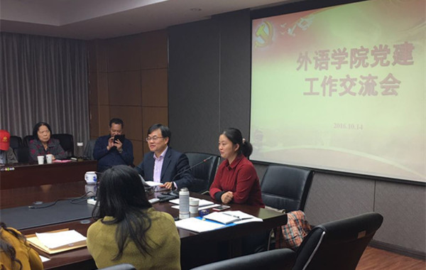 10月14日下午两点半,外语学院党建工作交流会在东五201举行。会议由学院党委书记褚超孚主持,全体领导班子成员、全体教职工党支部书记、各年级学生党支部书记参加了大会。
