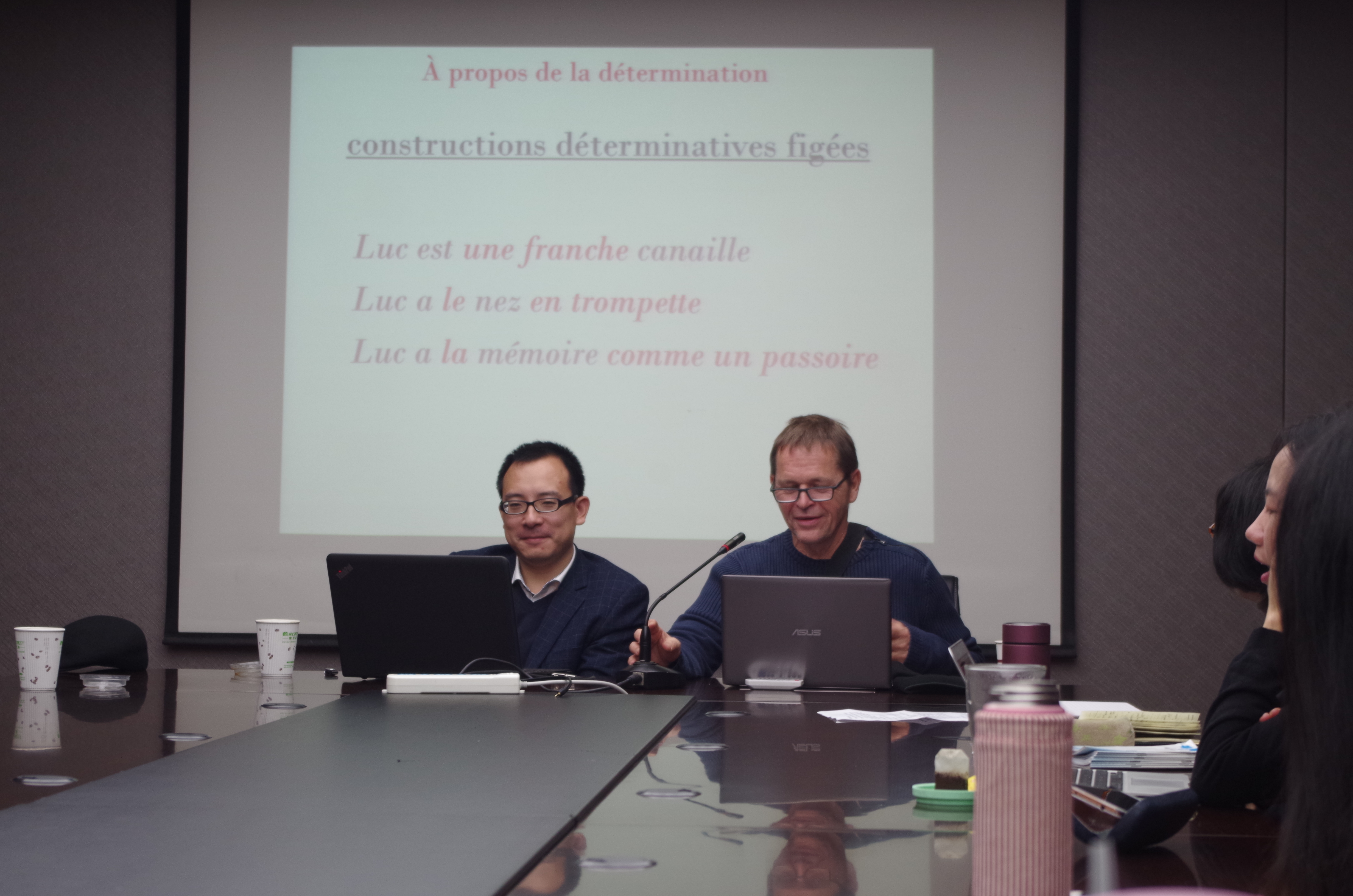 23日上午,巴黎十三大语言学团队的四位专家做了 “凝固语现象及其应用”问题的学术交流讲座。外院法语所教师、本科生及研究生聆听了讲座。首先由Pierre-André Buvet教授做了主题为“法语复杂限定结构和凝固结构”的讲座,接着Luis Meneses-Lerín教授强调了“凝固语在语言教学和翻译中的地位”,诸立超博士后则针对“中国的法语初学者的语言和文化互扰”问题和同学们进行了交流,最后Salah Mejri教授深入浅出地阐述了关于“语用词位和语言的第三分节”的观点。随后,同学们分别就主题内容对四位语言学家进行提问。讲座内容严谨而生动,语言风趣幽默,为法语语言教学和研究开拓了新的视野。