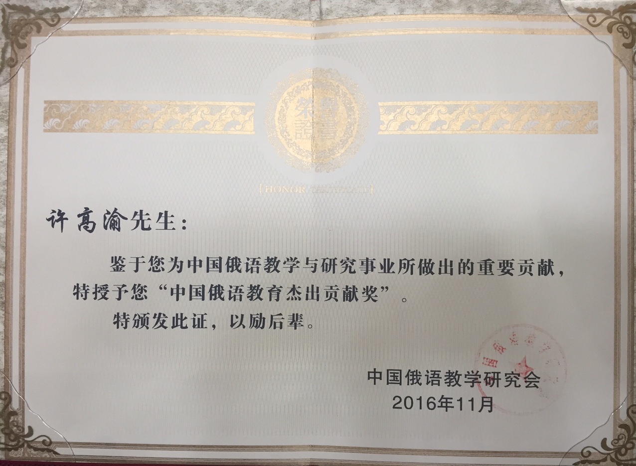 中国俄语教学研究会在11月12日“关于中国俄语教育终身成就奖和杰出贡献奖的表彰决定”中指出,许高渝教授等获奖者“是中国俄语学界前辈学者的杰出代表,是中国教育界的宝贵财富,其学养、成就和品德高山仰止,堪称学界楷模”。