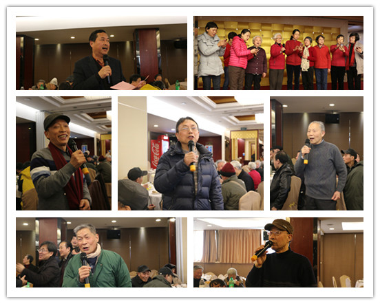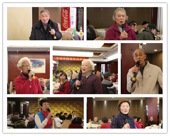 全场的气氛在《我和我的祖国》女生小合唱中推向一个新的高潮。10位女退休教师虽然年事已高,但嗓音优美,熟悉的旋律顿时让大家产生了深深的共鸣。在吴昶老师的带动下,随后一位位退休老师纷纷起身为大家献歌助兴,《天边》、《雪绒花》、《新年快乐》、《当你老了》……中文歌、俄语歌、英文歌……一曲曲美妙动人的音乐让大家沉浸在欢乐之中。蒋忠全老师则即兴作诗一首,为大家现场吟诵。