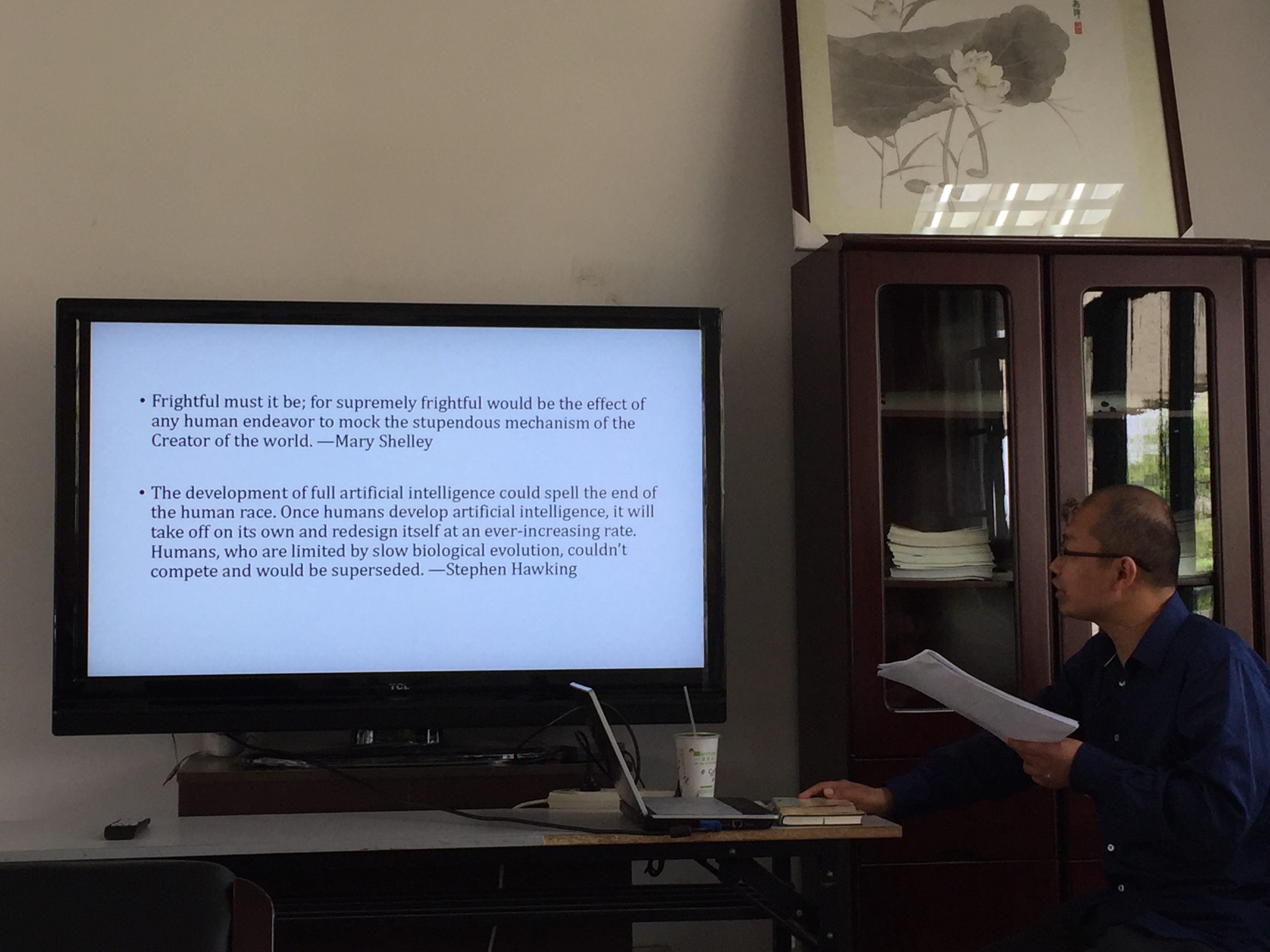 2017年4月14日下午在紫金港东五306,举行了一场别开生面的读书会。主讲人是教育部青年长江学者,中世纪与文艺复兴研究中心主任郝田虎教授。读书会主题是“人工智能何处去--谈弥尔顿、玛丽·雪莱与《机械姬》”。读书会由高奋教授主持,方凡教授、刘永强老师、外语学院学生以及其他院系的学生都来参加了这场读书会,到会人数约二十多人。