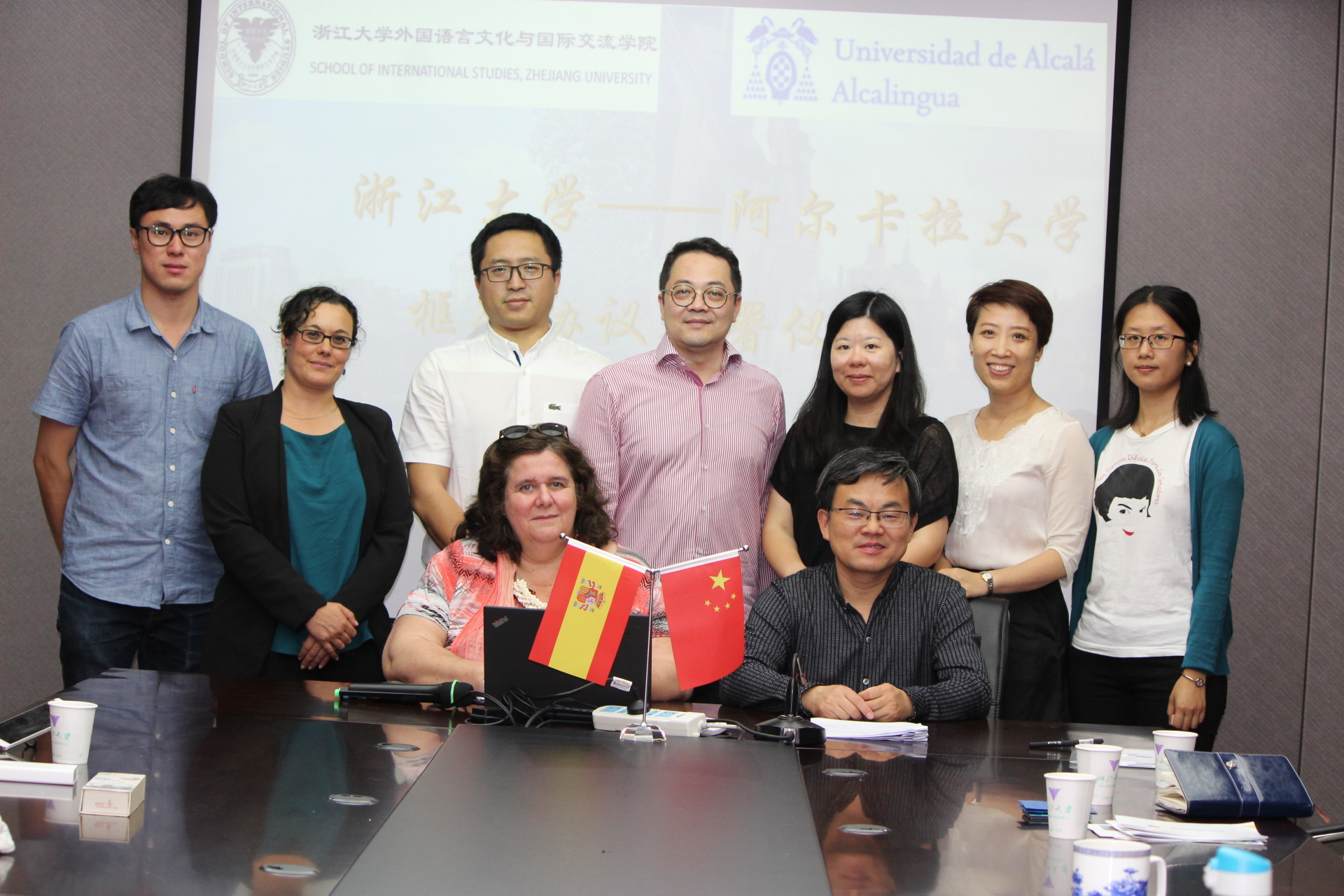 2017年6月13日,浙江大学外国语言文化与国际交流学院-西班牙阿尔卡拉大学语言学院合作协议签署仪式在东五201会议室内隆重举行。浙江大学外语学院党委副书记兼副院长褚超孚、副院长方凡,西班牙语所所长卢云老师、杨玲玲老师、杨骁老师,阿尔卡拉大学语言学院院长Maite及陪同史周峰先生、梅海涛先生,我校西班牙语专业2016级学生出席本次签署仪式。仪式由西班牙语所所长卢云主持。