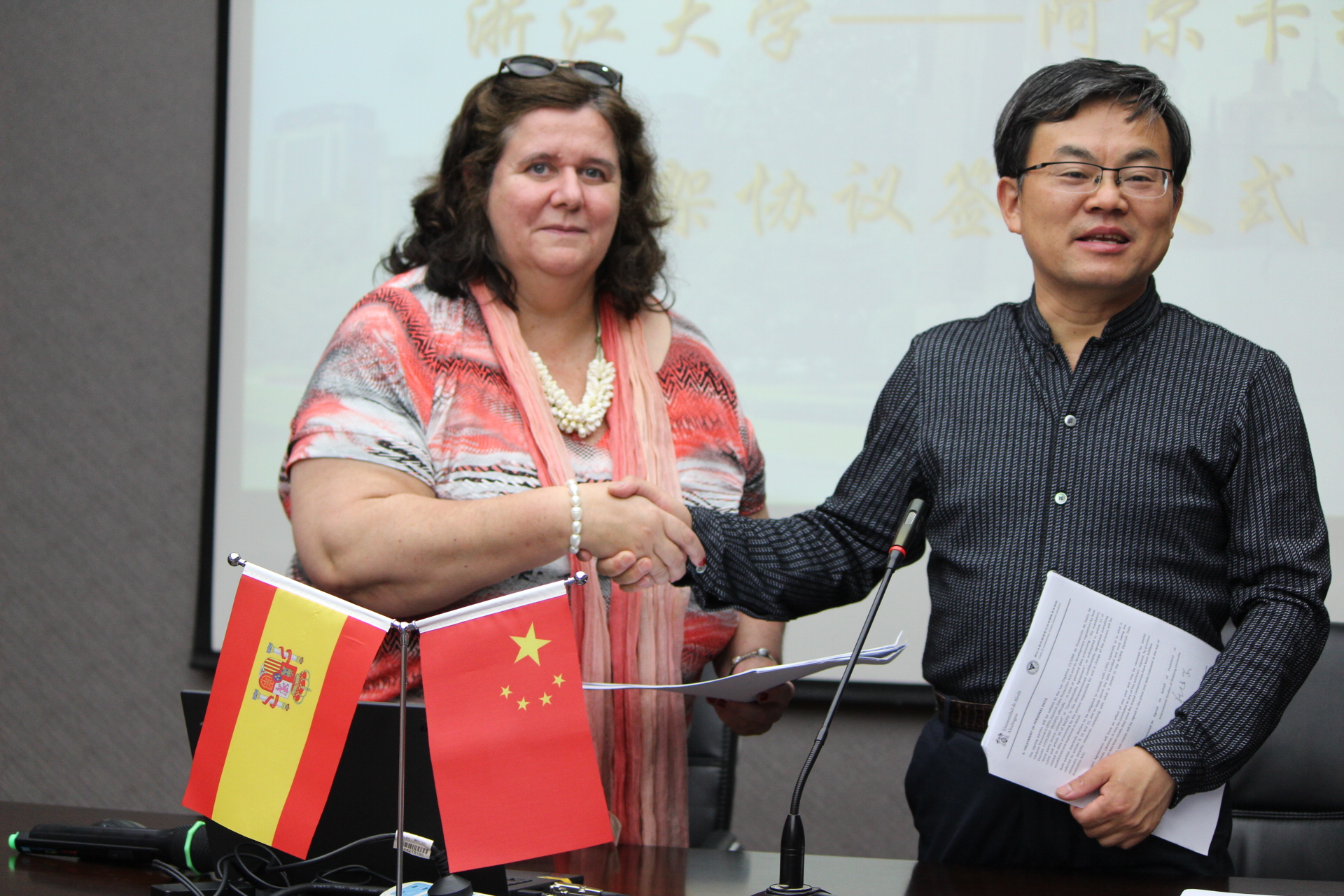 最后,双方签署了浙江大学外国语言文化与国际交流学院-西班牙阿尔卡拉大学语言学院合作协议,并合影留念。相信此次协议的签署会是我校与阿尔卡拉大学开展交流合作的历史见证,进一步推动我校西班牙语专业教学的发展。