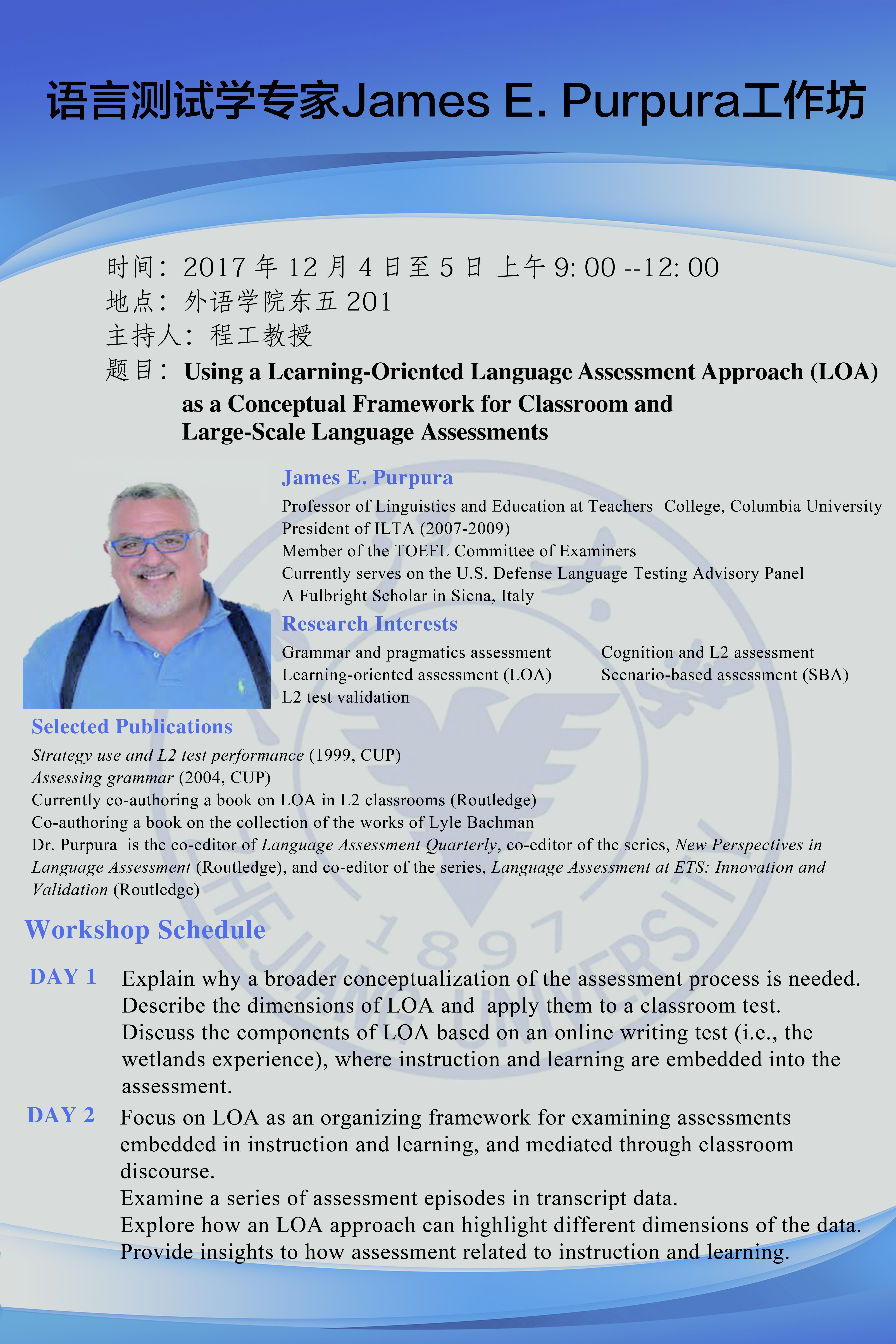 讲座题目: Using a Learning-Oriented Language Assessment Approach (LOA) as a Conceptual Framework for Classroom and Large-Scale Language Assessments