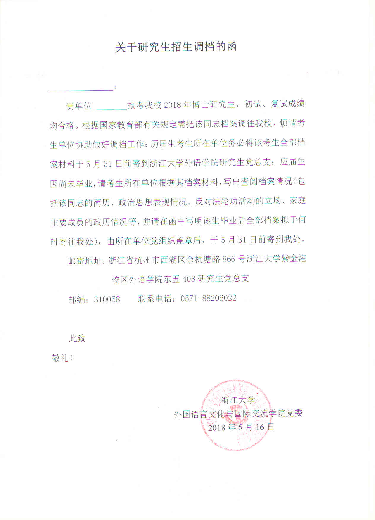 你们好!调档函已于5月16日以平信方式寄出,统考生是按复试时填写的调档函地址寄出,推免生是按报考登记表上的联系地址寄出,请各位同学催促档案单位按函上规定的时间(5月31日前)及时将档案(历届生)或查阅档案情况函(应届生)寄往我院。档案或查阅档案的情况函不到,不予发放录取通知书。