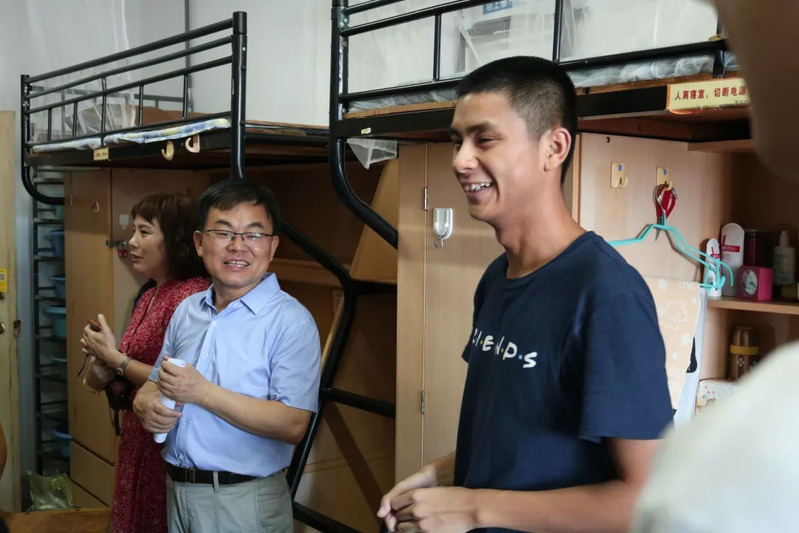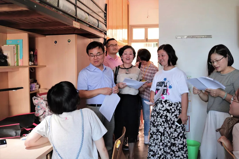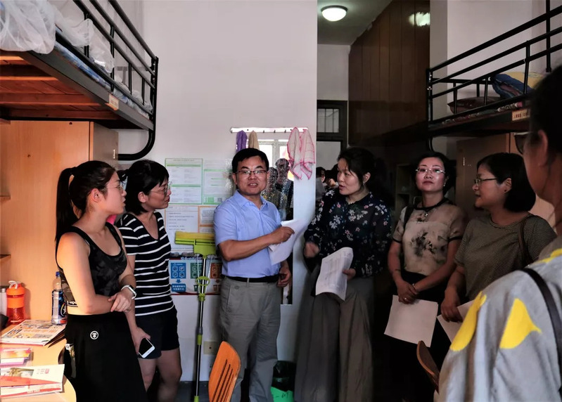 外语学院领导老师们首先来到青溪四舍的女生寝室,新生寝室集中分布在四楼,老师们上楼步伐很快,迫切的想要和新生们见上新学期的第一面。来到寝室后,褚超孚书记、李媛副院长、沈燎副书记等与学生们亲切交谈。学生从哪里来,父母是否在校,家长会是否会准时出席,报到顺不顺利,宿舍环境满不满意……一层楼十余个寝室,老师们耐心地寻访每一间寝室,不错过任何一个外语学院的新生,每到一处都问得十分详细。