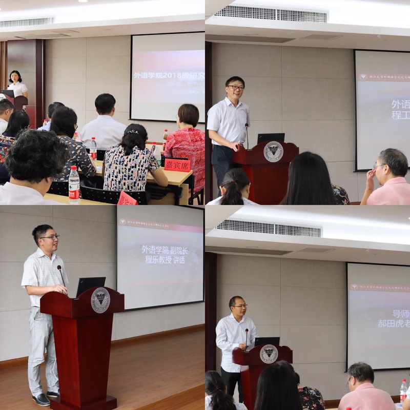 2018年9月14日上午9点,外语学院2018级研究生开学典礼在东六227顺利举行。外语学院院长程工、党委书记褚超孚、副院长程乐、方凡、副书记沈燎等学院领导出席大会,各学科负责人、研究生导师、德育导师、党政办主任、研究生科科长、团委书记等参加大会。会议由院党委副书记沈燎主持。