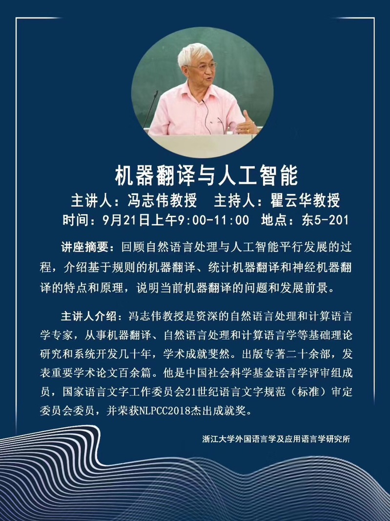 主讲人简介:冯志伟教授是资深的自然语言处理和计算语言学专家,从事机器翻译、自然语言处理和计算语言学等基础理论研究和系统开发几十年,学术成就斐然。出版专著二十余部,发表重要学术论文百余篇。他是中国社会科学基金语言学评审组成员,国家语言文字工作委员会21世纪语言文字规范(标准)审定委员会委员,并荣获NLPCC2018杰出成就奖。