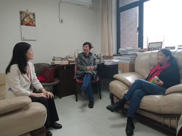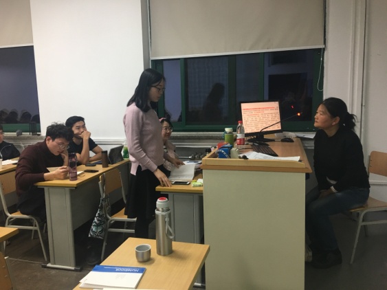 11月15日上午,高奋老师和朱振宇老师旁听了中国人民大学外语学院李平老师的《圣经文学》课程,李平老师当日讲解《旧约》中的《士师记》《路得记》,她先请四位学生就讲课内容作了课堂展示,而后再以提问引导的方式进行文本导读。李老师的课堂教学扎实系统,透露出了她深厚的学养,且很能激起学生的积极性。听课之后,高奋老师和朱振宇老师与代显梅、李平两位老师就外国文学方向本科及研究生的课程设置、教学方案、研究生指导等方面进行了交流。代显梅老师和李平老师介绍了中国人民大学外语学院的课程设置,教学安排、教学方法等,高老师和朱老师也分别向中国人民大学外语学院的老师介绍了浙江大学外语学院外国文学学科建设经验。之后,大家就外国文学研究与教学作了比较深入的学术交流。座谈之后,代显梅和李平老师带领高老师和朱老师参观了中国人民大学外语学院的资料室和著作陈列窗。代老师说,人大外语学院外国文学方向已经建设起比较整齐的教学及科研梯队,已经出版了多个系列的学术著作丛书和学术译著丛书。高老师指出,浙江大学外语学院外国文学研究所也有比较完善的学术梯队,以后要在出版学术丛书方面作更多努力。