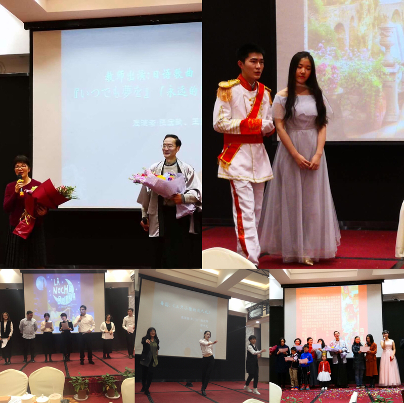 俄语语言文化研究所2018级同学的俄语歌曲《新年枞树歌》为茶话会奠定了祥和快乐的基调。接下来,西班牙语语言文化研究所的同学的西语电影主题曲《请记住我》以及西语所老师们的西班牙诗歌朗诵则将大家带到了爱的世界。深情演唱歌曲《有一天》之后,日语语言文化研究所额同学带来的舞蹈活力四射,引得台下喝彩声连连。法语专业同学们的法语歌曲《我们写在墙上》为茶话会增添了浪漫的气息。