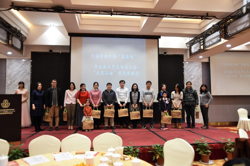 工会主席姚娅萍代表学院为今年结为秦晋之好的三对新人献上了礼物,亚欧语系支部书记陈新宇代表支部为“家有小娃”的青年教师送上慰问品和祝福。