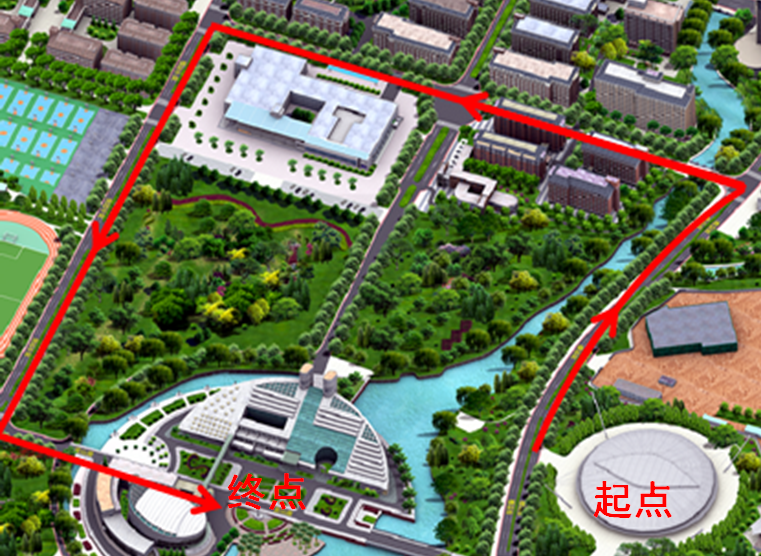 体育馆(起点,启动仪式及开场表演点)——藕舫路——吉安路——迪臣中路——宜山路——月牙楼(终点)