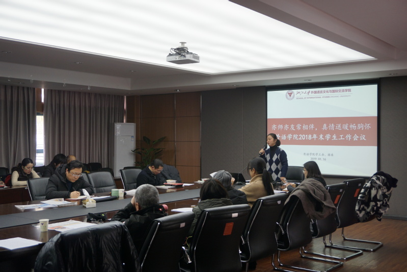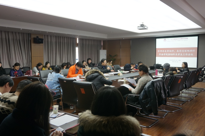2019年1月16日12时,外语学院2018年末学生工作会议在东五201会议室顺利召开。出席会议的有外语学院党委书记姚信、党委副书记沈燎、各系主任、专业负责人、本科生班主任、研究生德育导师以及本科生科、研究生科、团委、学工办的老师们。本次会议由学院党委副书记沈燎主持。