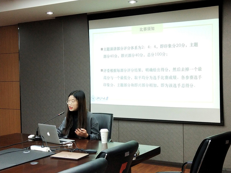 3月31日上午9点30分,浙江大学第五届英文系英语演讲比赛决赛在东五201教室举行。本次大赛由浙江大学外国语言文化与国际交流学院英文系主办,英文系学生会承办。大赛邀请了外语学院陈艳华老师,傅政老师和卢燕飞老师(按姓氏首字母排序)在非工作日时间作为嘉宾评委出席。经过初赛选拔,9名选手最终成功晋级决赛。