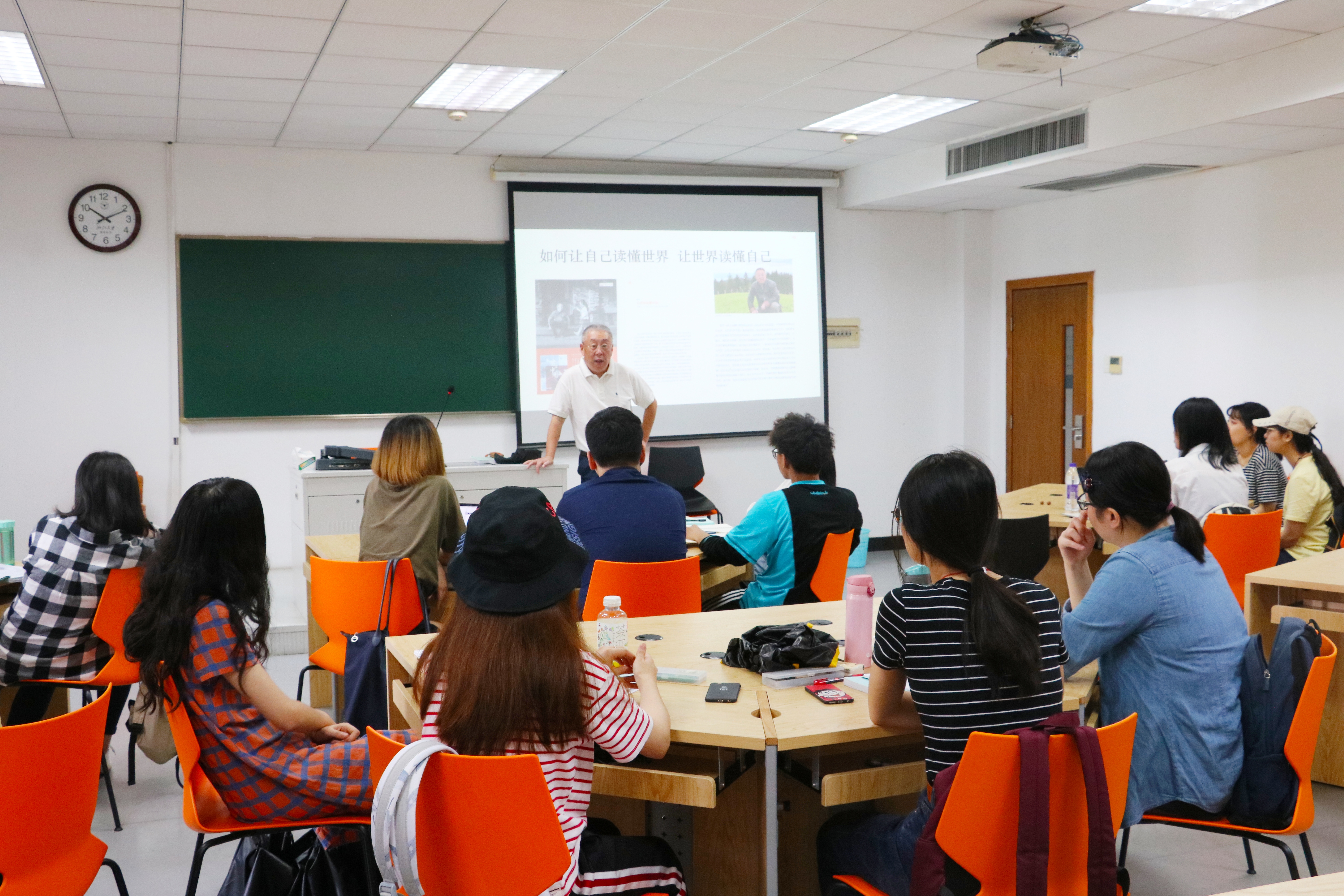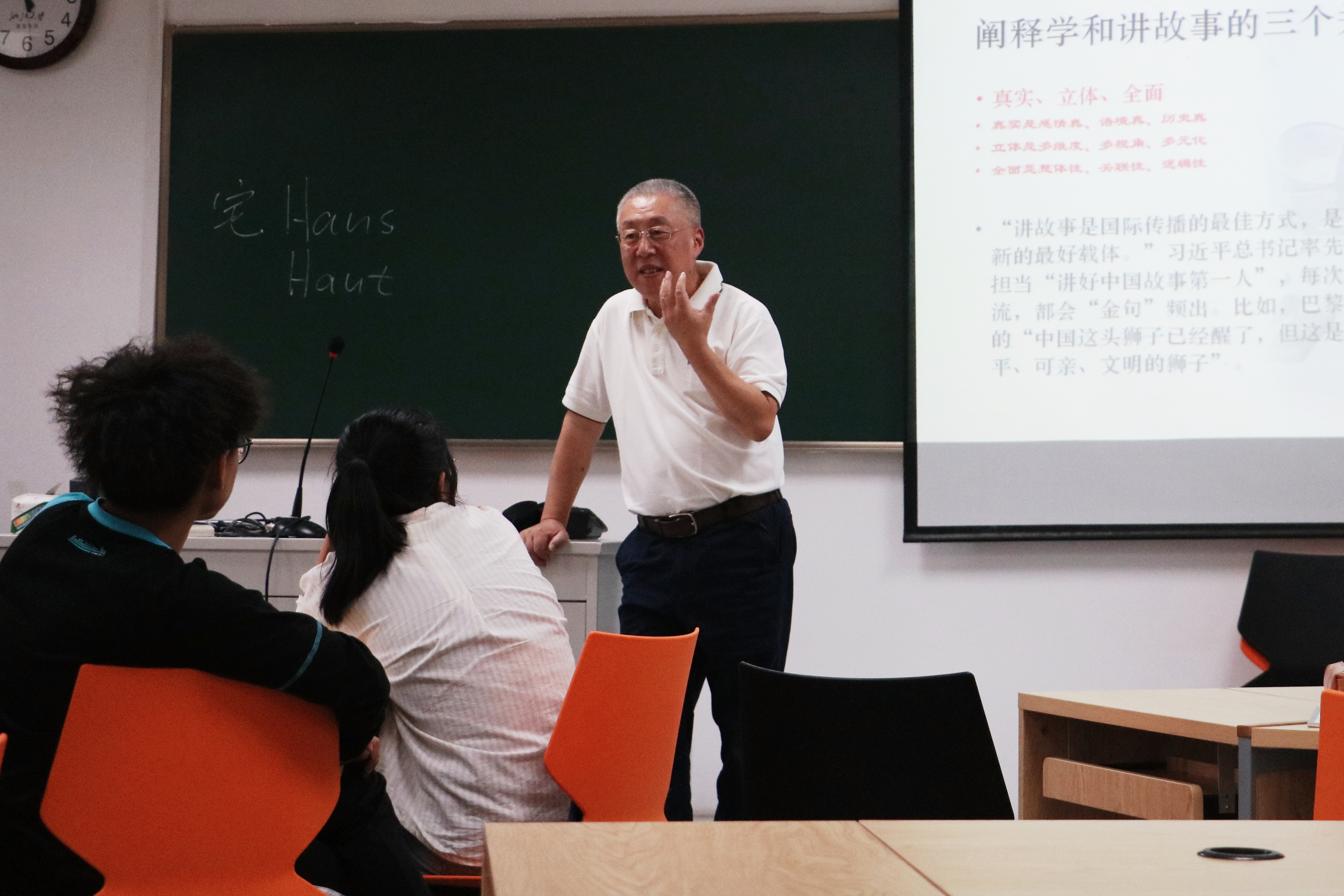 范老师由此强调,这正应了习近平总书记的箴言:“讲故事是国际传播的最佳方式,是话语创新的最好载体”。以真实、立体、全面的方式讲述中国故事,将会达到最好的传播效果,从而让世界更好地理解中国。范老师最后提醒在座的学生:“故事是故去的事,是源远流长的中国文化;声音是要发出今天的声音。”开学第一课在同学们的掌声中结束。