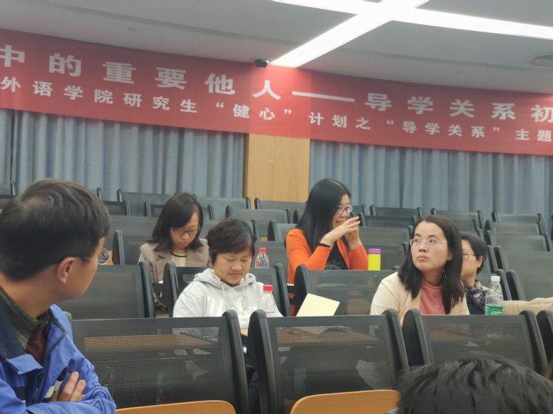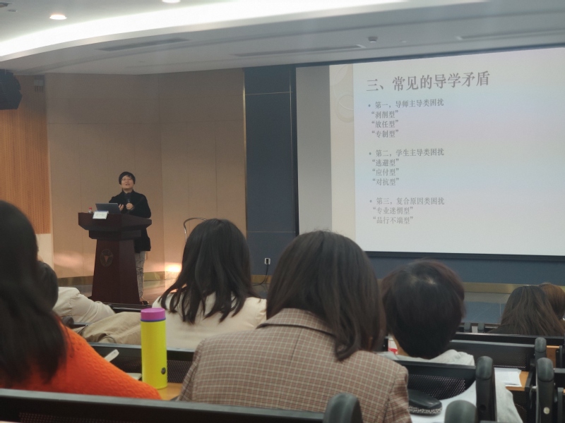 最后,祝老师和在场的导师们针对具体问题进行了研讨。针对导师们的提问,祝老师结合心理中心曾遇到过的案例,为大家讲述了学生在面对不同类型的导师培养方式时的感受和心路历程,鼓励大家换位思考,同时也给大家提出了一些如何与学生沟通的建议。接着,祝老师围绕如何提升导学关系这个问题,从学校、导师、学生三个方面进行了分析,并给出了一些小小的建议。