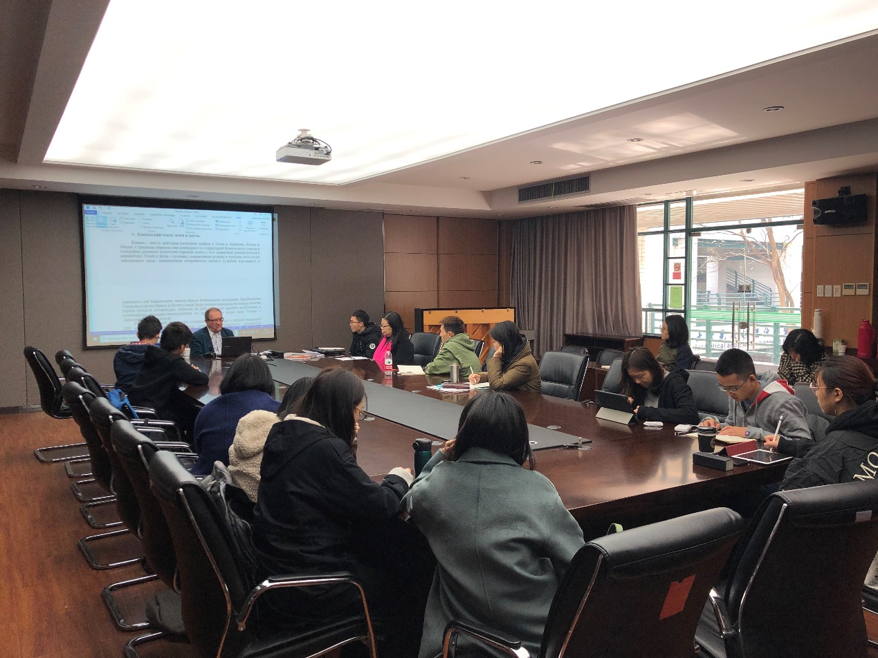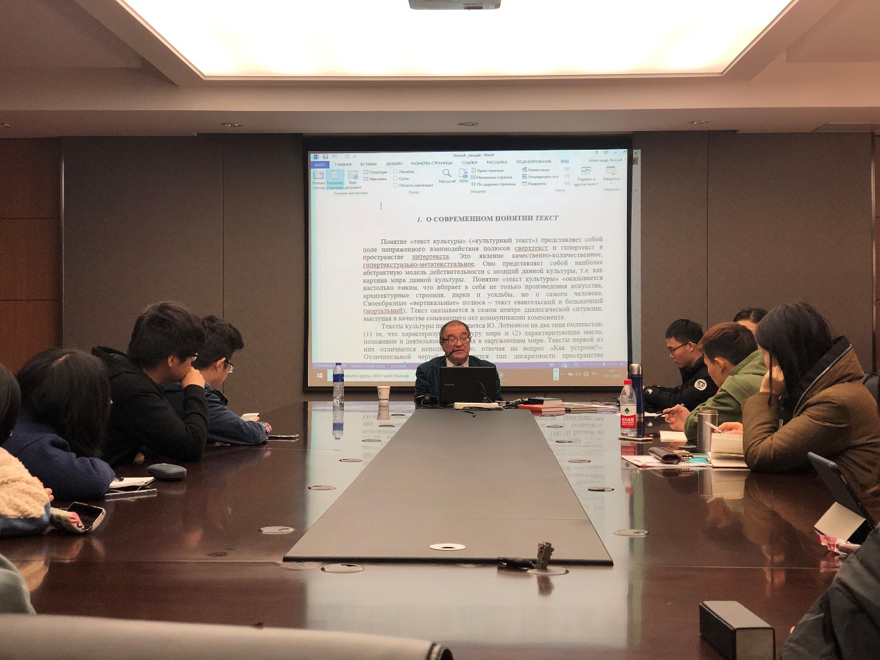 11月19日,外语学院俄语所于浙江大学紫金港校区东五201室成功举办了一场题为“谈谈俄罗斯文学的文本学概念:作为地方文本体系与总和的文学”的讲座,本次讲座由俄语所周露老师主持。本场讲座有幸邀请到了俄罗斯知名文学批评家、文化学家、地方志专家、政论家、记者、俄罗斯广播电视人文学院亚历山大·巴夫洛维奇·柳叟(Люсый Александр Павлович)教授,他曾先后担任俄罗斯文化史研究院艺术史部研究员,俄罗斯文化和自然遗产研究院文化基础研究中心研究员,俄罗斯科学院“世界文化史”科学委员会社会和文化全球化问题分会会员。