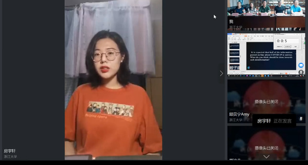 第一轮比赛的结果很快揭晓,得分前七名的选手脱颖而出,进入第二轮的比赛。第二轮竞赛中,选手们将在线上抽取题目,短暂准备后进行即兴演讲,同时回答评委老师提出的问题。本轮题目与新冠肺炎疫情密切相关,并结合东西方的文化差异,以全球化的角度看待这一全人类所面临的重大挑战。选手不仅需要具有本土情怀和国际视野,还要结合实际,用英语传达出自己的想法。选手们胸有成竹,有条不紊地完成了演讲,并顺利回答了评委老师的问题。第二轮比赛结果揭晓前,我们进行了二轮抽奖活动。