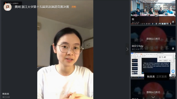 2020年6月5日下午3时,浙江大学第十五届英语演讲竞赛暨2020“外研社・国才杯”全国英语演讲大赛校赛选拔赛决赛以线上线下双会场、视频会议和直播同步进行的方式顺利举办。本次比赛由浙江大学本科生院主办,共青团浙江大学委员会、浙江大学外国语言文化与国际交流学院、浙江大学外语演讲竞赛实践基地承办。经过两个月的自四月开赛以来,共收到来自25个学院(系)、学园百余份作品。最终,14位选手脱颖而出,顺利进入本次决赛,进行最终比拼。