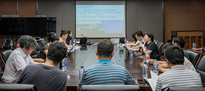 2020年6月17日下午12:30-16:00,英语语言文学学科2020年导师培训活动暨“‘双一流’背景下英语语言文学学科导学共同体建设”主题论坛、浙江大学外语学院“青荷说”教师发展论坛在浙江大学紫金港校区外语学院东五201成功举行。本次活动旨在深入贯彻党的十九大精神,以习近平新时代中国特色社会主义思想为指导,围绕学校“双一流”建设总体目标,为坚持立德树人,着力建设一支师德高尚、关爱学生、业务精湛的高水平导师队伍,努力成为展示高等教育发展优越性的“重要窗口”而建言献策。学院党委姚信书记、沈燎副书记、学院分管研究生工作的程乐副院长、研究生科科长傅利琴老师、英语语言文学学科点全体硕、博导师和学科秘书出席了会议。学院副院长兼英语系系主任方凡老师致开幕词,并对各位领导及老师的到来表示欢迎和感谢。