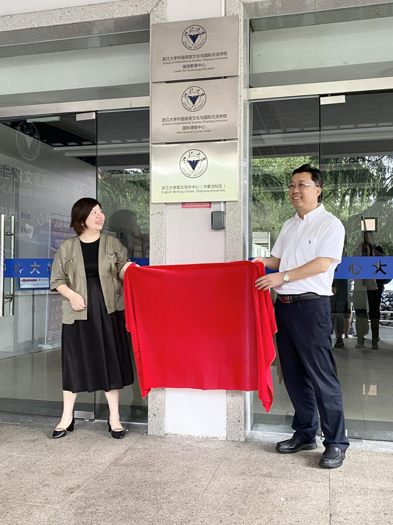 浙江大学英文写作中心华家池校区分点正式成立!6月24日下午2点,浙江大学外国语言文化与国际交流学院党委书记姚信和副院长、英文写作中心主任方凡在浙大华家池校区中心南楼共同为英文写作中心揭牌。