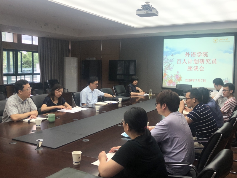 2020年7月7日上午9:00,外语学院“百人计划”研究员座谈会在东五201举行。副校长何莲珍受邀参加会议,院长程工、党委书记姚信、“百人计划”研究员代表和人事科相关人员参加会议,会议由姚信老师主持。