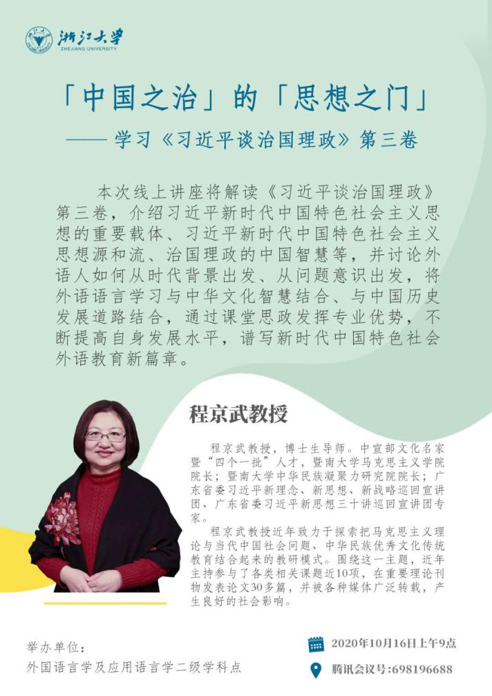 2020年10月16日上午,中宣部文化名家暨“四个一批”人才,暨南大学马克思主义学院院长,暨南大学中华文明凝聚力研究院院长,广东省委习近平新理念、新思想、新战略巡回宣讲团、广东省委习近平新思想三十讲巡回宣讲团专家程京武教授,为我院外国语言学及应用语言学二级学科的硕士生导师们带来了一场思想学习讲座。本次讲座以“中国之治的思想之门——学习《习近平谈治国理政》第三卷”为题,介绍了习近平新时代中国特色社会主义思想的重要载体,程教授和与会老师们细致探讨了外语人如何通过“课堂思政”发挥自身外语学科的专业优势,如何借鉴习近平新时代治国理政的新智慧,从而对研究生培养和教育的具体环节有所启迪。讲座由语言与翻译系系主任、博士生导师蒋景阳教授主持。