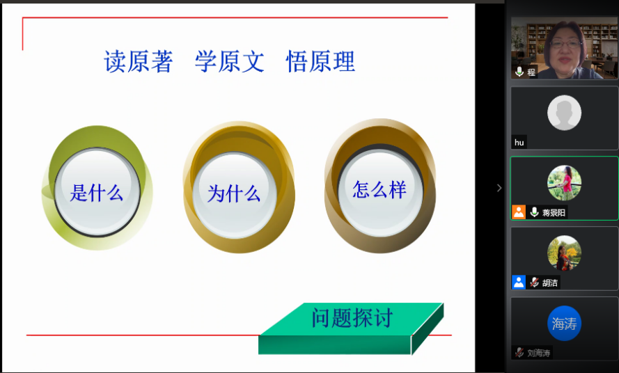 程教授指出,要根据不同学科专业的特色和优势分类推进课程思政建设,深入梳理专业课教学内容,结合不同课程特点、思维方法和价值理念,深入挖掘课程思政元素,有机融入课程教学,达到润物无声的育人效果。以浙江大学外语学院外国语言学及应用语言学二级学科的几个学科方向为例,如理论语言学、计量语言学、语言能力与评估等,导师们要在课程教学中帮助学生掌握马克思主义世界观和方法论,从历史与现实、理论与实践等维度深刻理解习近平新时代中国特色社会主义思想,使各类课程与思政教育同向同行。要结合专业知识教育,如在原著阅读中,围绕 “是什么”“为什么”“怎么样”不断地引导学生深入的思考问题,深刻的理解社会主义核心价值观,自觉弘扬中华优秀传统文化、革命文化、社会主义先进文化。同时,也要在课程教学中把马克思主义立场观点方法的教育与科学精神的培养结合起来,提高学生正确认识问题、分析问题和解决问题的能力。要注重科学思维方法的训练和科学伦理的教育,培养学生探索未知、追求真理、勇攀科学高峰的责任感和使命感。