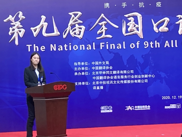 2020年12月19日(周六),由中国外文局指导、中国翻译协会主办的第九届全国口译大赛(英语)总决赛在北京中国外文局举行。浙江大学学生代表张云飞(翻译2016级)与涂韶轩(大气科学2017级)双双荣获交传总决赛二等奖。