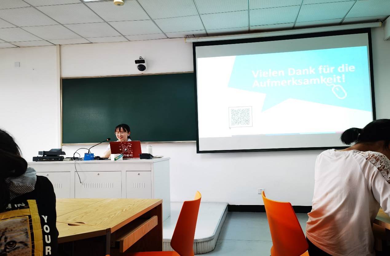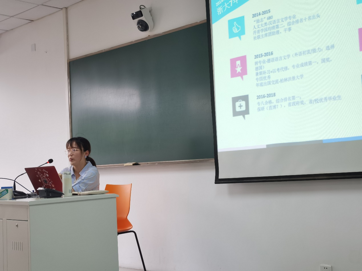 黄含笑首先介绍了她在浙江大学的生活和学习经历,包括大学期间参加的学生组织与社团活动,出国交流学习的经历等。随后,她结合自己的经验,向在座学弟学妹们分享了她在德语专业学习方面的方法和经验,如利用空余时间练习德语听力,锻炼语感;利用A4纸背单词等。