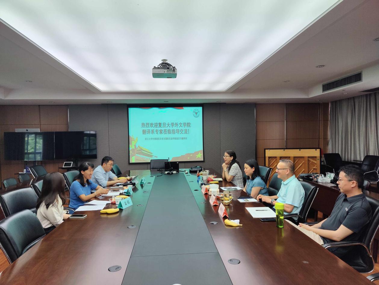 首先,郭国良教授致辞,他对复旦大学外文学院翻译系老师们的来访表示热烈欢迎。他说复旦大学和浙江大学都是国内著名的综合性大学,学生培养和专业建设有很多共同之处,双方除了竞争,更应该积极开展合作,本次复旦大学翻译系老师们来访,正是双方合作交流的开始。陶友兰教授表示非常高兴能有机会来浙大交流研讨。她介绍了复旦大学翻译专业的师资力量、人才培养特色、课程建设等情况。接着,卢巧丹老师介绍了浙江大学翻译专业的师资力量、培养方案和教学特色等。她重点介绍了浙大翻译专业创新实践教学体系,该体系以 “浙里译”工作室为实战平台,以《翻译工作坊》课程为中心,以计算机辅助实验室为网络平台,经过几年的实践,成果丰硕,同学们除了完成了大量的翻译实践,已有30余本译著正式出版。陶友兰教授对以工作室的形式协同翻译书籍的做法高度认可,她认为这种形式很好地实现了翻译理论和实践的融合。徐雪英老师介绍了浙大翻译专业的课程思政建设和一流课程建设。她还和朱晓宇老师共同介绍了浙江大学的国际化能力培养基地(原国际精英组织人才班)的师资力量、培养方案以及所取得的成绩。他们说注重学生国际化能力的培养也正是浙大翻译专业的人才培养特色之一。何文忠老师以自己的计算机辅助翻译课程为例,介绍了以出版为导向的学生翻译能力培养模式,他还简要介绍了技术传播课程和语料库语言学课程的建设。接着,陶友兰老师和何文忠老师就计算机辅助翻译、朱晓宇老师和王炎强老师就两校口译课程设置和口译实践、徐雪英老师和姜倩老师就翻译工作坊课程建设等展开了积极的交流互动。