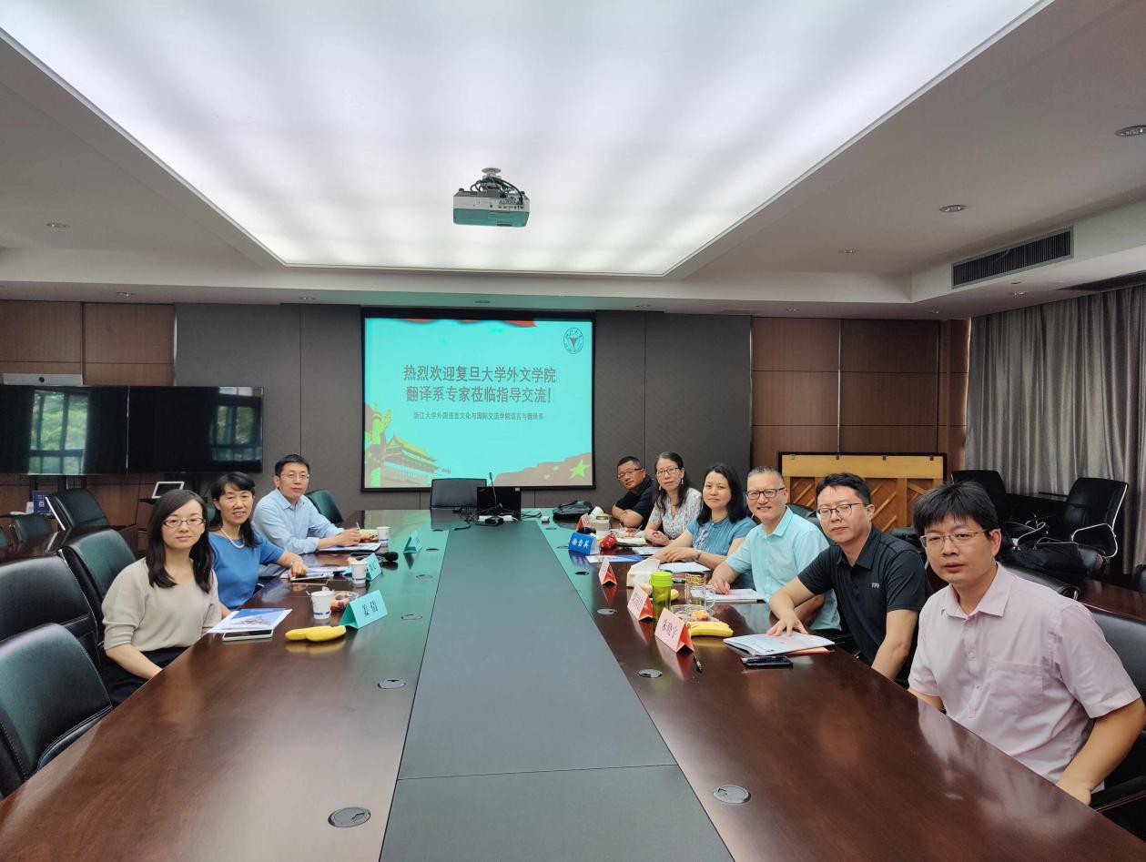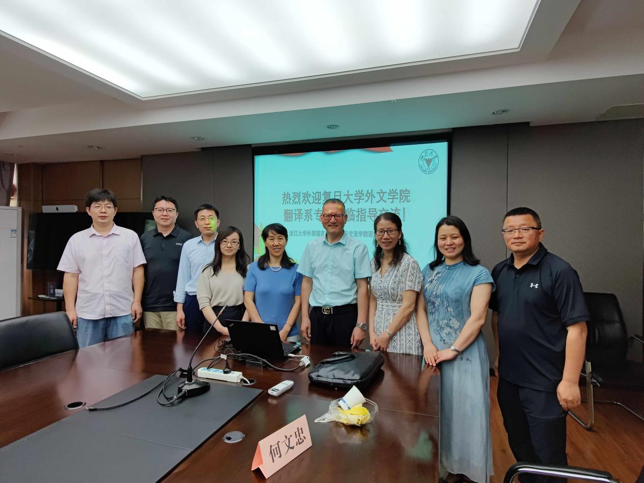 2021年6月11日上午,在浙江大学外语学院东五201会议室,复旦大学外文学院翻译系三位专家和我院语言与翻译系的老师们就翻译专业建设开展了教学交流与研讨,研讨会由语言与翻译系副主任卢巧丹老师主持。复旦大学外文学院翻译系主任陶友兰教授、翻译系副主任王炎强副教授和姜倩副教授,浙江大学翻译学研究所所长郭国良教授、副所长徐雪英副教授、何文忠副教授、冯全功副教授、朱晓宇高级讲师参加了研讨会。双方教师就翻译专业的课程设置、课程思政建设、口笔译课程的教授方法、学生翻译实践与理论能力提升、学生能力培养等问题展开了深入交流与积极互动。