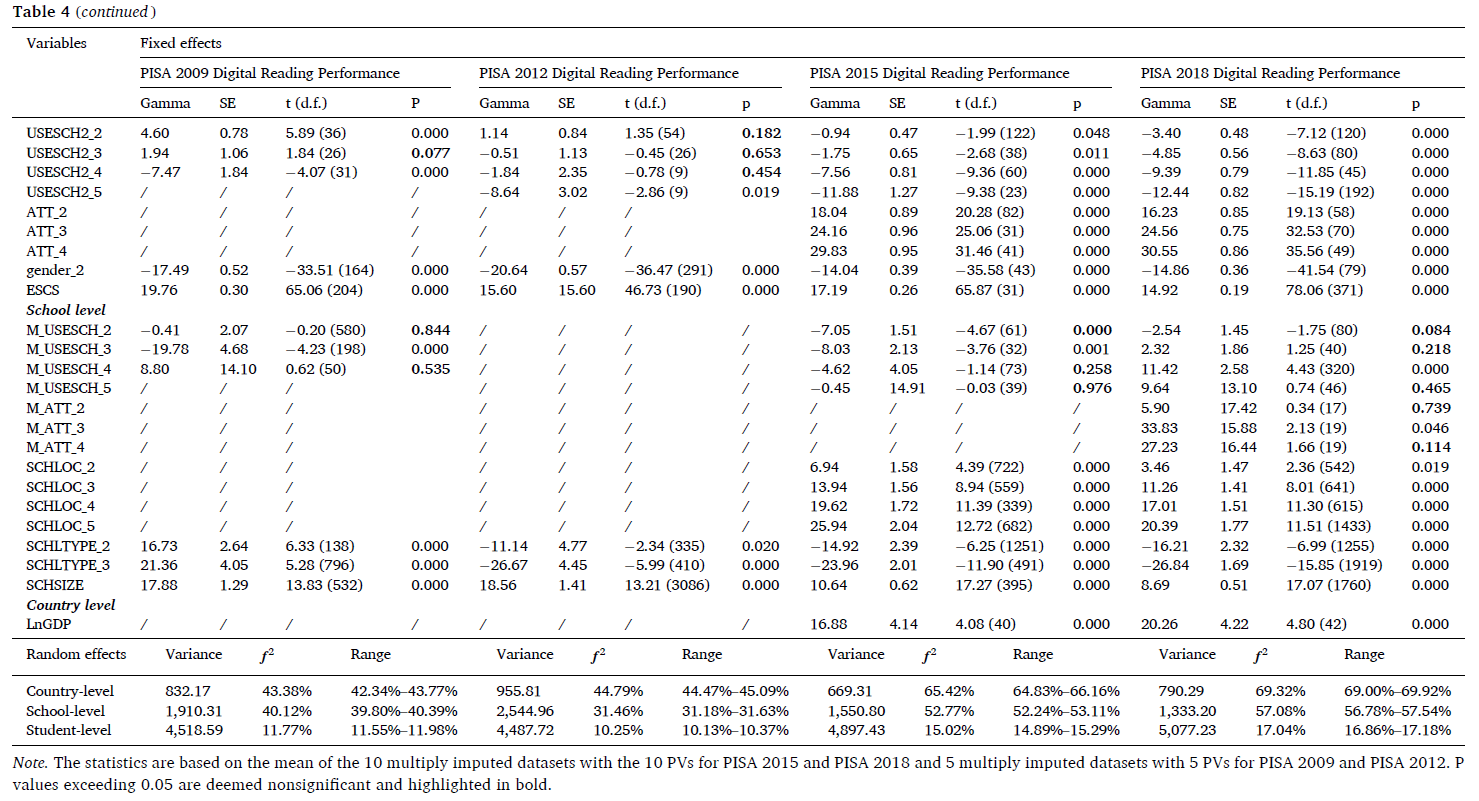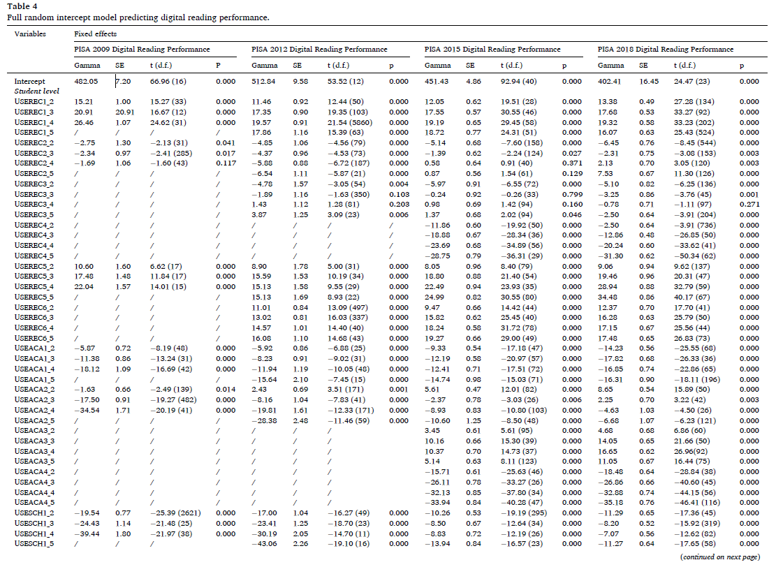 研究团队基于PISA数据库的嵌套数据特性和跨轮次可比性优势,从学生、学校和国家层面探索了社交媒体使用因素和态度因素对青少年数字化阅读素养成绩的影响,揭示了最新四轮PISA测试开展的近十年间社交媒体对数字化阅读素养影响的动态变化。通过逐步建立多层线性模型,研究发现校外社交媒体使用频率对于数字化阅读素养的影响因不同的使用目的(娱乐型或学习型)而异;因社交媒体的不同类型(如聊天软件、社交网站等)而异;历时方面,社交媒体对于数字化阅读素养影响模式在四轮测试间保持相对稳定;PISA 2009、PISA 2012、PISA 2015、PISA 2018结果分析显示,学生在学校使用社交媒体的频率与数字化阅读素养成绩总体呈负相关。此外,研究发现在数字化阅读测评中,对社交媒体持积极态度的学生比持消极态度的学生表现更佳。该研究还首次探索了社交媒体对数字化阅读素养成绩影响的跨年度动态变化,揭示了社交媒体日益提升的重要作用和其十余年间较为稳定的影响模式。该研究样本量庞大、时间跨度广,多维度、多层次地揭示了社交媒体对青少年数字化阅读素养成绩的影响,研究结果有利于教育研究者更全面地把握社交媒体的特性和数字化阅读素养成绩提升的关键,可以有效地在社交媒体用户增长和数字化阅读普及的后疫情时代启发青少年阅读教育实践。
