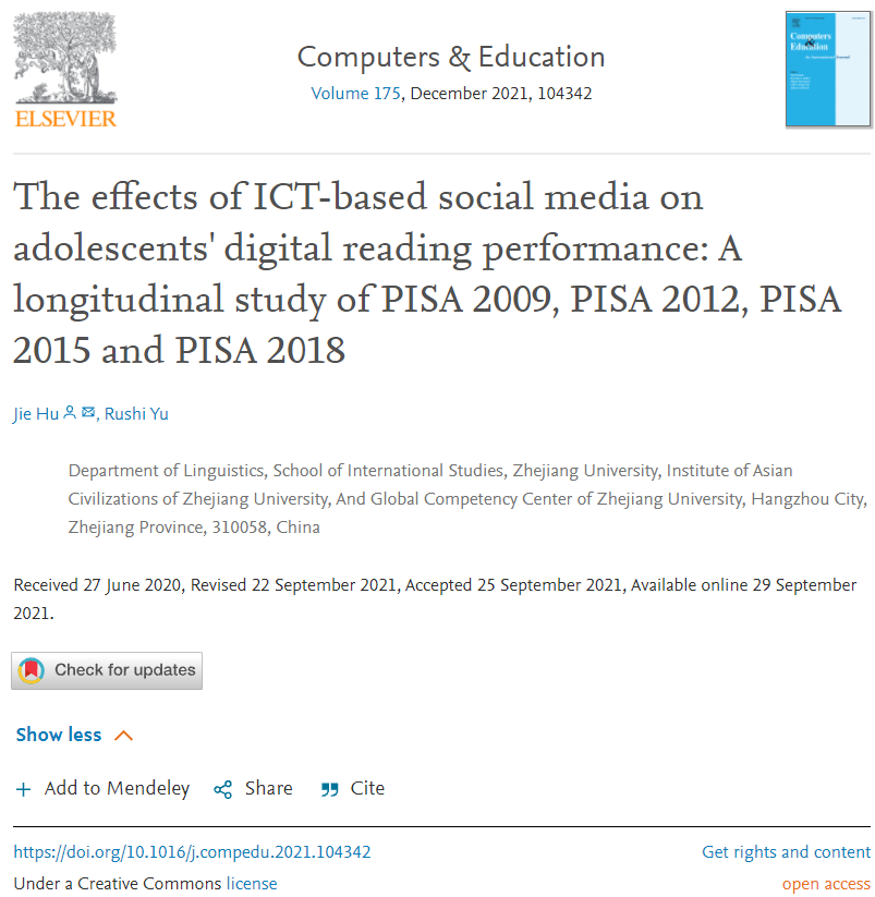 2021年9月29日,浙江大学外国语言文化与国际交流学院“百人计划”研究员胡洁团队在国际教育技术领域排名第1的SSCI顶级期刊Computers & Education发表了的最新研究成果“The effects of ICT-based social media on adolescents' digital reading performance: A longitudinal study of PISA 2009, PISA 2012, PISA 2015 and PISA 2018”(期刊影响因子8.538),这也是该团队第2次以浙江大学为第一单位在该期刊发表研究论文。