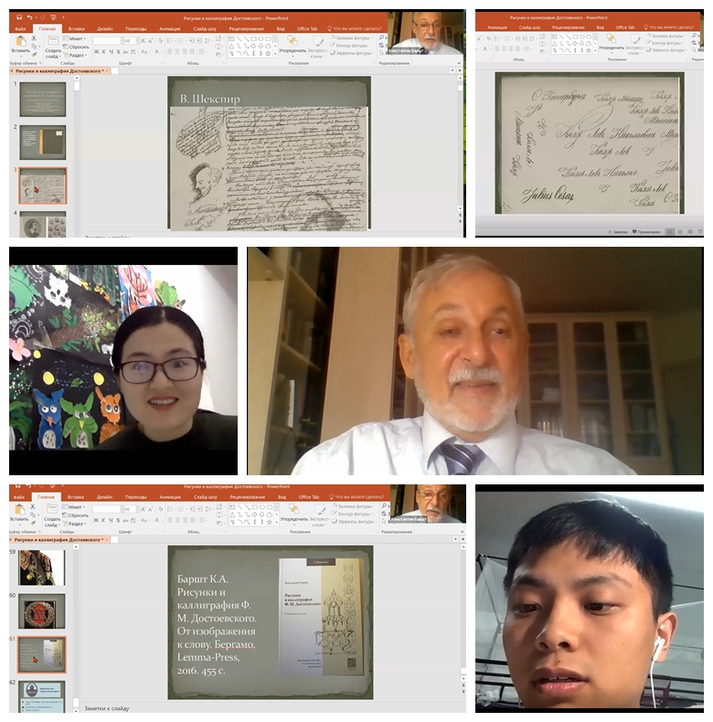 2021年10月7日晚,浙江大学外语学院俄语所举办的“俄罗斯文学启真讲坛”第20场如期举行!讲座题为“陀思妥耶夫斯基的图画与书法”,主讲嘉宾是普希金之家的巴尔什特教授。本场讲座由俄语所薛冉冉副教授担任主持人。来自北京大学、南京大学、北京外国语大学、圣彼得堡大学、莫斯科大学等40多所国内外高校、机构的老师与研究生60余名俄罗斯文学研究者及爱好者聆听了这场讲座。