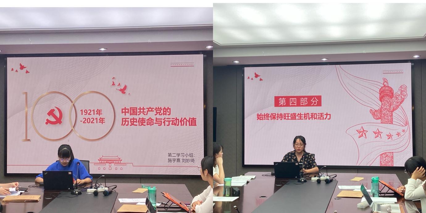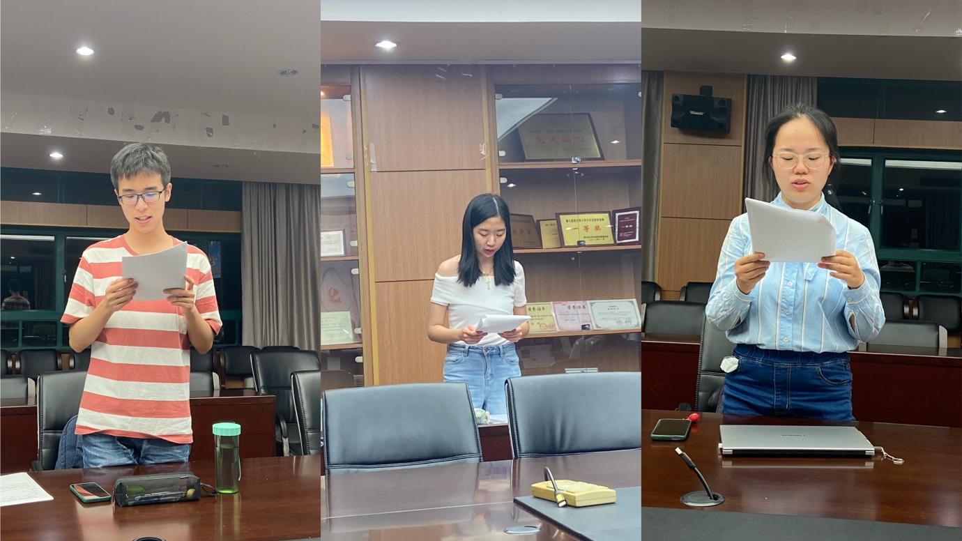 最后,支部开展了浙江大学新发展阶段使命愿景大讨论的活动,围绕大学的使命愿景、新时代外语人的使命担当及实践方法展开了讨论。杨丹旎老师首先分享了她的看法,浙江大学作为中国一流大学,在立足浙江的基础上,必须面向全国,树立足够远大的目标,保持坚定的信念,肩负起担当和使命。而外语人的使命之一就是讲好中国故事,为了完成这个使命,外语学院的同学不仅要把语言学好,了解中国,也要了解目标国家的民情和文化,从而起到更好的传播效果。蔡正伍同学引用了培根“读书足以怡情,足以博彩,足以长才”的观点从三个层面提出了大学的发展方向。同时,他认为当今翻译人最需要做的就是“翻译中国”,尤其要懂得调和意识形态和文化差异上的矛盾。最后,卓雨奇同学结合浙江大学已有的“知识-能力-素质-人格”四位一体的教育体系,强调了塑造健全人格的重要性。她也提出了外语人应该具有家国情怀,将个人命运同国家发展相结合,把中国声音带向世界。
