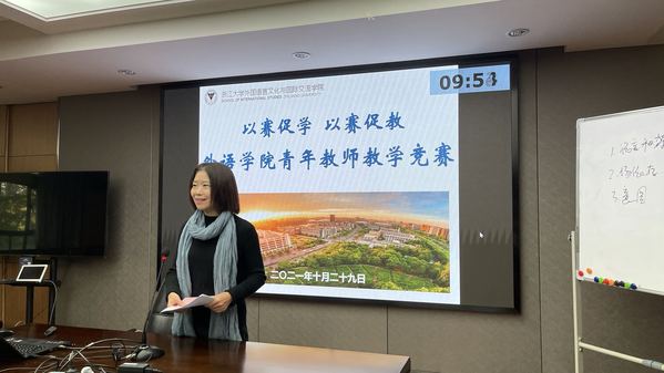 三尺讲台育英才守初心,立德树人筑未来担使命。2021年10月29日下午,外语学院2021年度青年教师教学竞赛决赛在深秋岁暮时节正式开赛。本次赛事由学院工会、学院本科与继续教育科共同主办,赛事邀请学院本科教学委员会委员代表、院党委委员代表、专业/基层教学组织负责人代表、本科教学督导代表等8位专家,与学生代表共同组成赛事评委组。学院工会主席姚娅萍莅临比赛现场,学院青年教师到现场观摩。