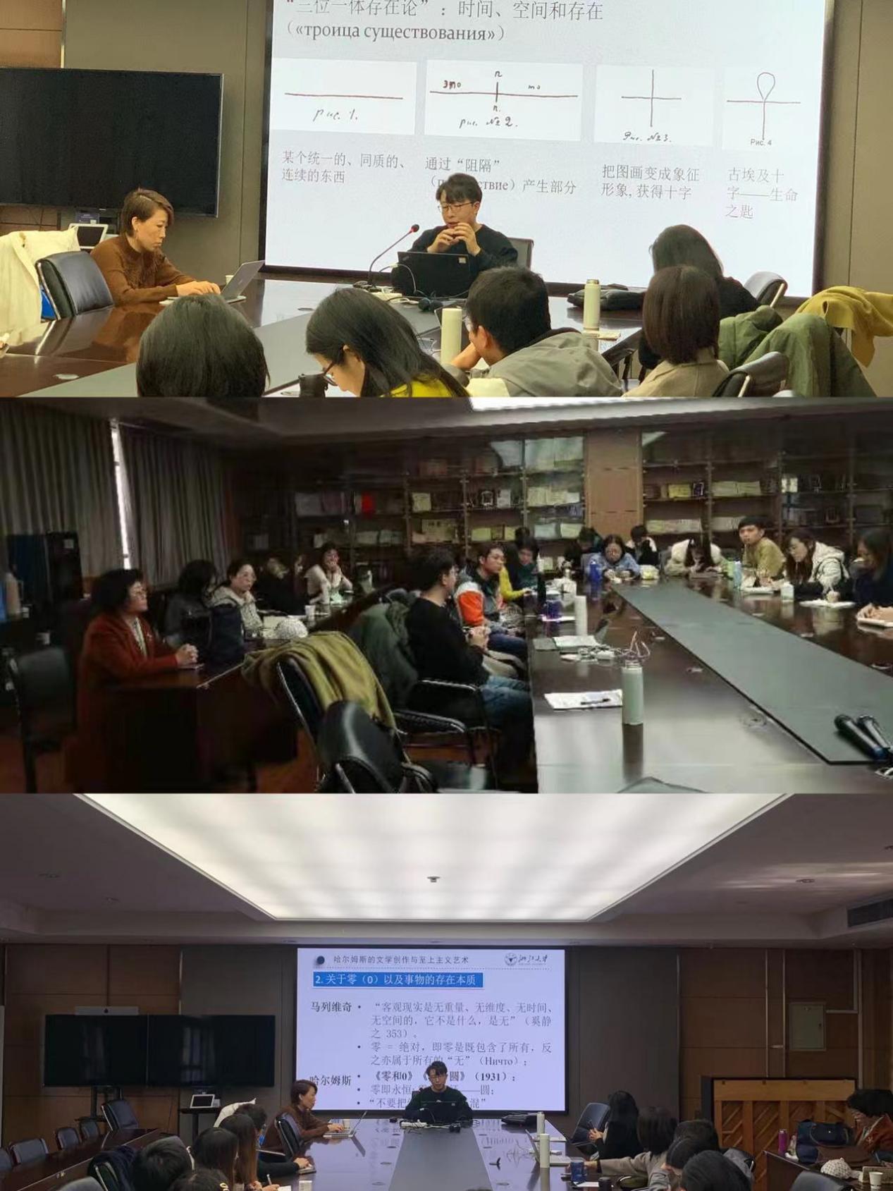 王永教授对讲座进行了高屋建瓴的点评。她指出,本次讲座是借鉴艺术学视角进行文学研究的优秀范例,“什么样的文本适合跨学科研究”“如何开展跨学科研究”,是研究者应牢记并解答的问题。随后,其他老师分别从至上主义和立体主义的关系、讲座的结构优化、哈尔姆斯对马列维奇绘画的反向影响等方面,提出了各自问题和意见。研究生们也踊跃提问,就哈尔姆斯的政治和宗教观、作家同宇宙主义的联系等,请主讲人做出了详细阐释。视角新颖、主题深刻的讲座引起了热烈讨论。