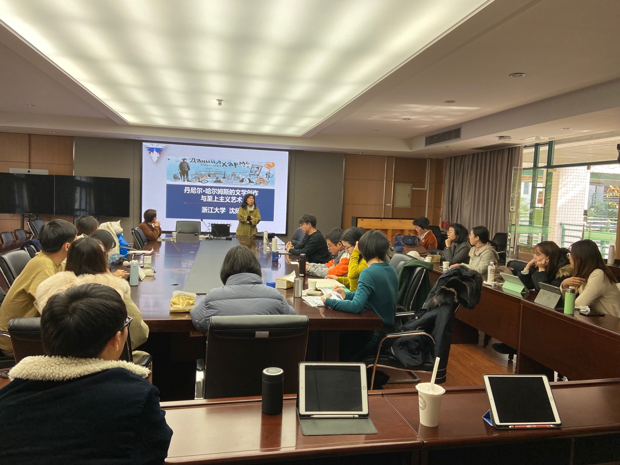 2021年11月23日,俄语语言文化研究所的导学团队“教研相长、共轭驱动”学术沙龙第三期在外语学院东5-201成功举办。本次活动由沈扬博士后担任主讲人,以《丹尼尔•哈尔姆斯的文学创作与至上主义艺术》为主题,陈新宇教授主持,邀请外语学院第五党支部书记卢云教授、亚欧语系系主任李媛教授同俄语专业硕博研究生、俄语所全体老师参加了此次活动。