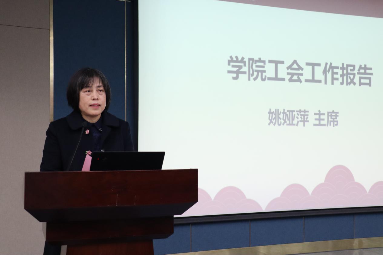 工会主席姚娅萍作《凝心聚力、构建和谐,为外语学院持续稳定发展保驾护航》工会工作报告。学院工会始终坚持以“党建带工建,工建促党建”的工作思路,围绕学院中心工作,认真履行职责、积极创新方法,落实师生为本的理念,在参与学院民主管理、依法维护教师职工权益等方面交出了高质量答卷,在为学院一流学科建设添砖加瓦,助力推进学院各项事业高质量内涵式发展中发挥了重要作用。